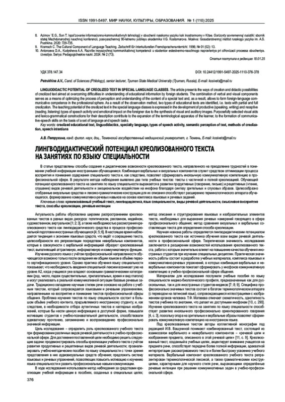 В статье представлены способы создания и дидактические возможности креолизованного текста, направленного на преодоление трудностей в понимании учебной информации иностранными обучающимися. Комбинация вербальных и визуальных компонентов служит средством оптимизации процесса восприятия и понимания содержания специального текста и, как следствие, позволяет сформировать иноязычную коммуникативную компетенцию в профессиональной сфере. В результате метода наблюдения выявлено два типа учебных текстов: тексты с частичной и полной креолизацией. Обучающий потенциал креолизованного текста на занятиях по языку специальности выражается в развитии продуктивных (говорение, письмо) и рецептивных (чтение, слушание) видов речевой деятельности и эмоциональном воздействии на инофона благодаря синтезу зрительных и слуховых образов. Целесообразно отобранные визуальные средства и лексико-грамматические конструкции для их описания способствуют расширению терминологического аппарата обучающегося, формированию коммуникативно-речевых навыков на основе комплекса языковых и речевых заданий.