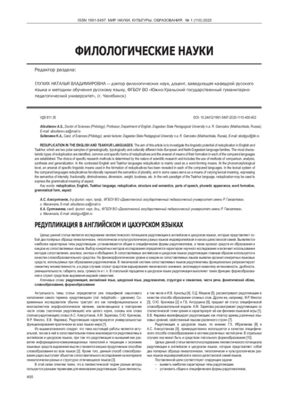 Целью данной статьи является исследование лингвистического потенциала редупликации в английском и цахурском языках, которые представляют собой два полярных образца генеалогически, типологически и культурологически разных языков индоевропейской и нахско-дагестанской семей. Выявляются наиболее характерные типы редупликации, устанавливаются общие и специфические формы редупликативов, а также арсенал средств их образования в каждом из сопоставляемых языков. Выбор конкретных методов исследования определяется характером научного исследования и включает использование методов сопоставления, анализа, синтеза и обобщения. В сопоставляемых английском и цахурском языках редупликация главным образом используется в качестве словообразовательного средства. На фономорфологическом уровне в каждом из сопоставляемых языков выявлен арсенал конкретных языковых средств, используемых при образовании редупликативов. В лексической системе сопоставляемых языков редупликативы функционально репрезентируют семантику множественности, а в ряде случаев служат средством варьирования лексического значения, эксплицируя семантику интенсивности, дробности, уменьшительности, габарита, веса, громкости и т. п. В глагольной парадигме в цахурском языке редупликация выполняет также функцию формообразования и служит средством выражения видовой семантики.