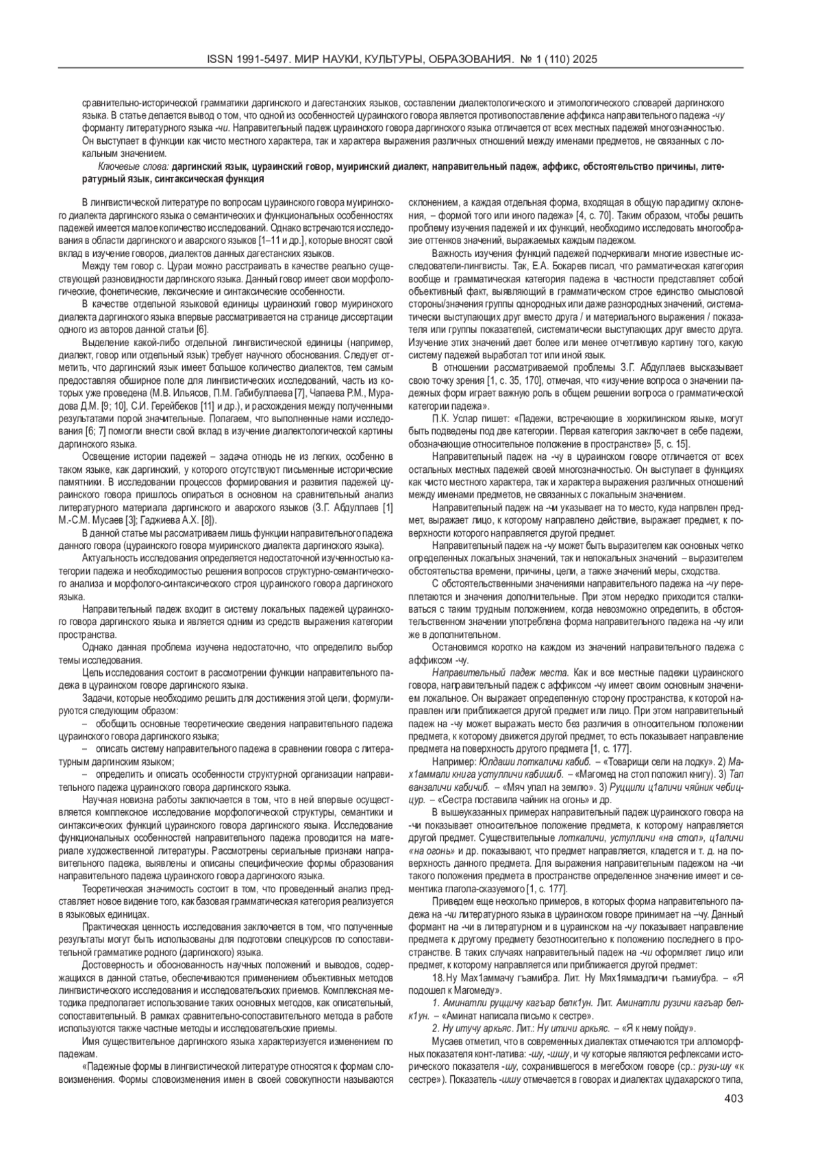 Статья представляет собой попытку рассмотреть всевозможные отличительные особенности направительного падежа цураинского говора муиринского диалекта даргинского языка. В данной статье использован синхронный метод. В тех случаях, когда данные исследуемого говора не всегда поддаются однозначному объяснению, использован метод синхронного сопоставления с литературным даргинским языком и другими локальными единицами. В исследовании имеют место описательный и сравнительно-исторический методы. Результаты исследования могут быть использованы в преподавании даргинского языка в школе, при изучении курса даргинской диалектологии в вузе, при составлении учебников и методических пособий по диалектологии, создании сравнительно-исторической грамматики даргинского и дагестанских языков, составлении диалектологического и этимологического словарей даргинского языка. В статье делается вывод о том, что одной из особенностей цураинского говора является противопоставление аффикса направительного падежа -чу форманту литературного языка -чи. Направительный падеж цураинского говора даргинского языка отличается от всех местных падежей многозначностью. Он выступает в функции как чисто местного характера, так и характера выражения различных отношений между именами предметов, не связанных с локальным значением.