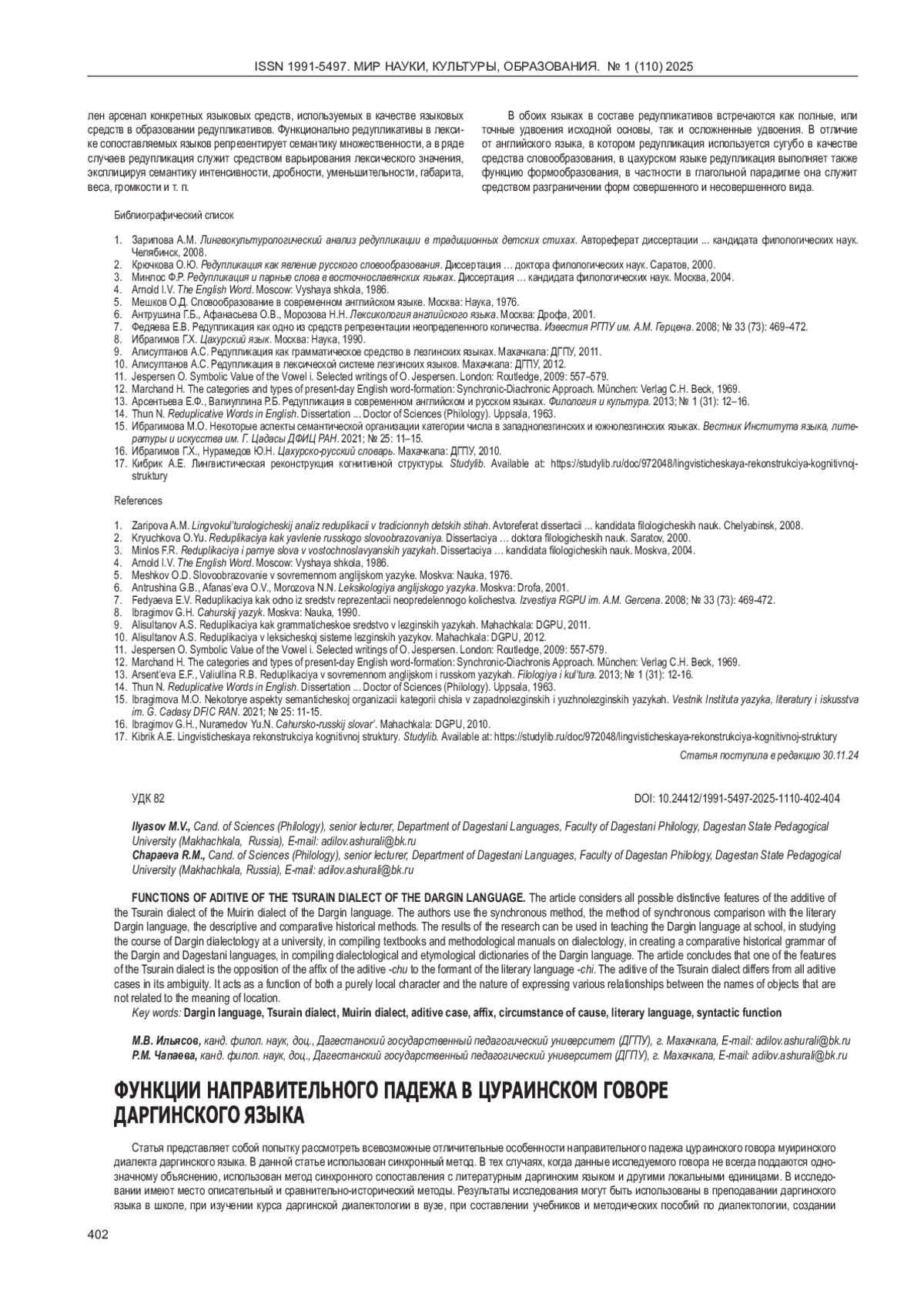 10. 	Чапаева Р.М., Мурадова Д.М. Имя числительное в нижнемулебкинском говоре даргинского языка. Известия Дагестанского государственного педагогического университета. Общественные и гуманитарные науки. 2015; № 1 (30): 105-108. EDN: TMMAQF