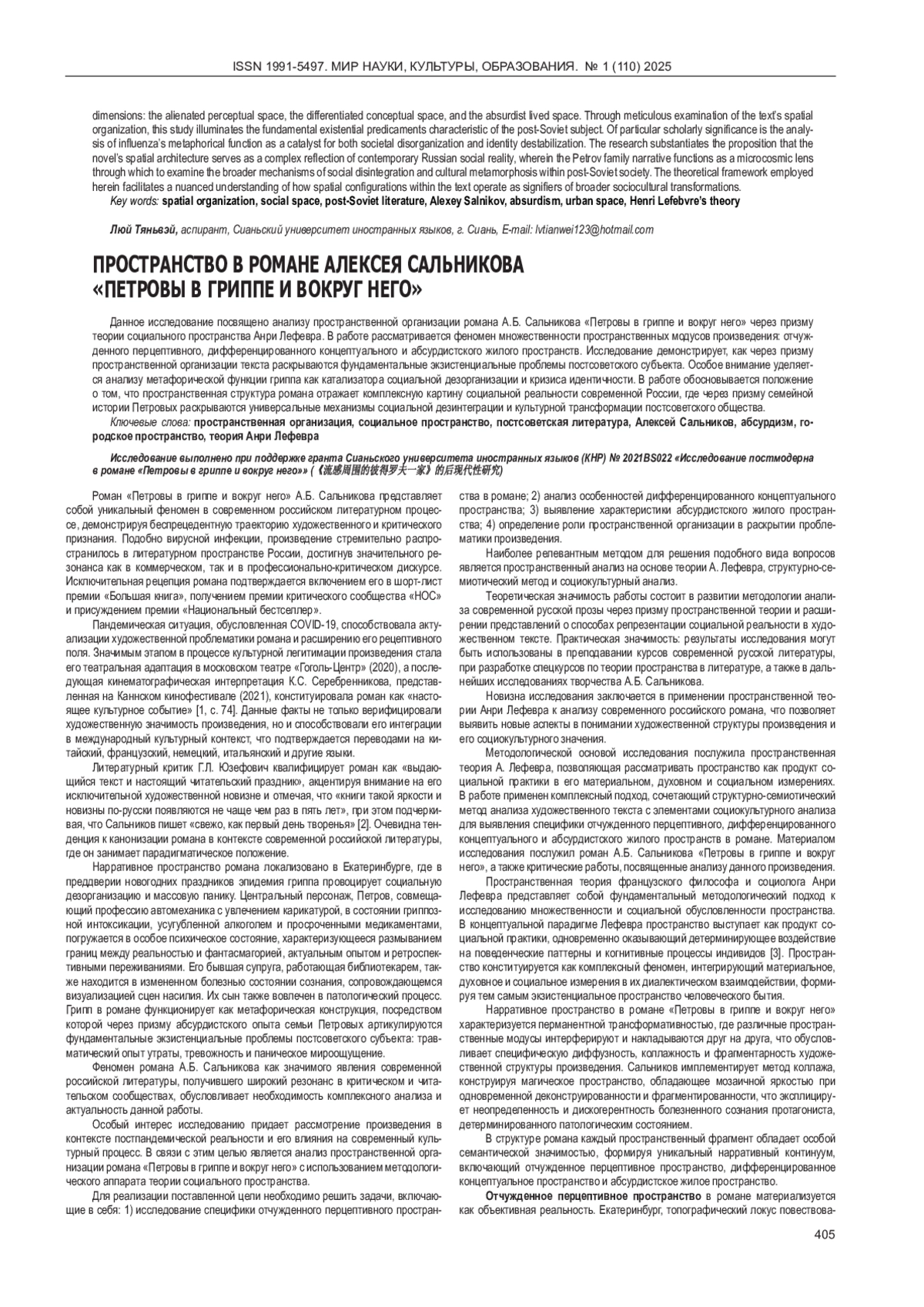 Данное исследование посвящено анализу пространственной организации романа А. Б. Сальникова «Петровы в гриппе и вокруг него» через призму теории социального пространства Анри Лефевра. В работе рассматривается феномен множественности пространственных модусов произведения: отчужденного перцептивного, дифференцированного концептуального и абсурдистского жилого пространств. Исследование демонстрирует, как через призму пространственной организации текста раскрываются фундаментальные экзистенциальные проблемы постсоветского субъекта. Особое внимание уделяется анализу метафорической функции гриппа как катализатора социальной дезорганизации и кризиса идентичности. В работе обосновывается положение о том, что пространственная структура романа отражает комплексную картину социальной реальности современной России, где через призму семейной истории Петровых раскрываются универсальные механизмы социальной дезинтеграции и культурной трансформации постсоветского общества.