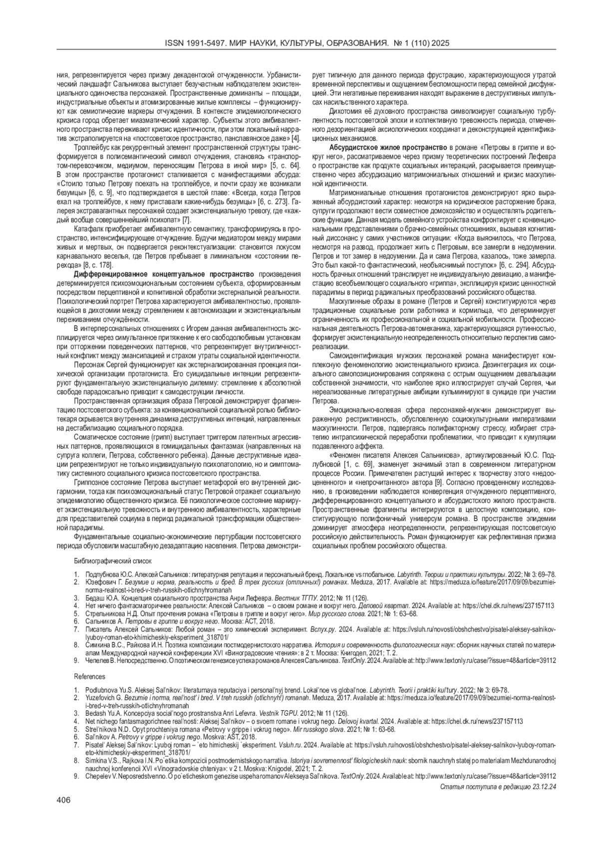5. 	Стрельникова Н.Д. Опыт прочтения романа “Петровы в гриппе и вокруг него”. Мир русского слова. 2021; № 1: 63-68. EDN: JOTONU