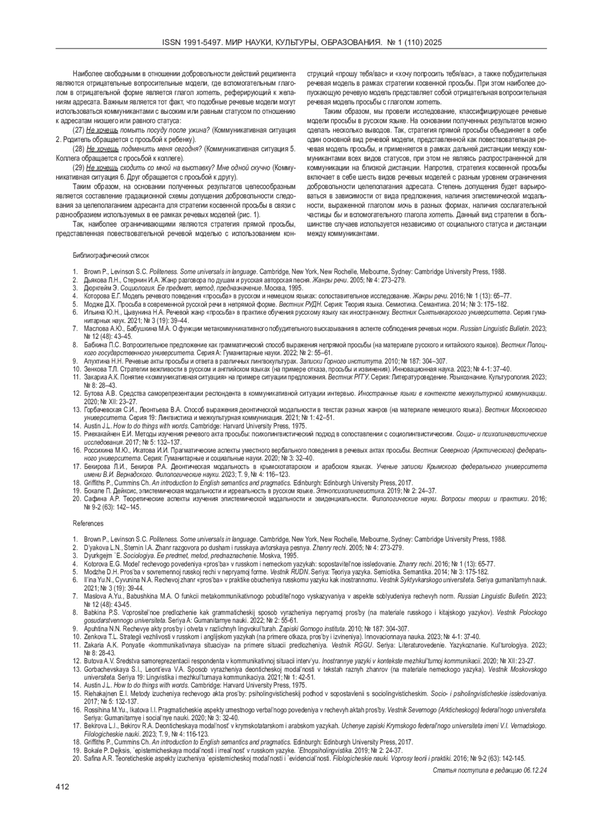 5. 	Модже Д.Х. Просьба в современной русской речи в непрямой форме. Вестник РУДН. Серия: Теория языка. Семиотика. Семантика. 2014; № 3: 175-182.