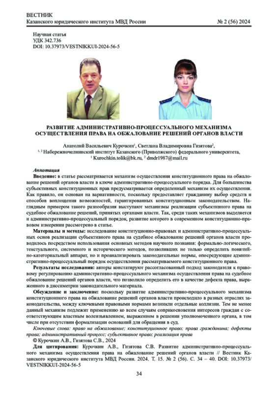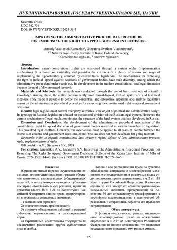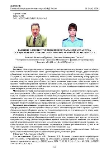 Введение: в статье рассматривается механизм осуществления конституционного права на обжалование решений органов власти в ключе административно-процессуального порядка. Для большинства субъективных конституционных прав предусматривается определенный механизм их осуществления. Как правило, он основан на вариативности, поскольку предоставляет гражданину выбор средств и способов воплощения возможностей, гарантированных конституционным законодательством. Наглядным примером такого разнообразия выступают механизмы реализации субъективного права на судебное обжалование решений, принятых органами власти. Так, среди таких механизмов выделяется и административно-процессуальный порядок, развитие которого в современном конституционно-правовом измерении рассмотрено в статье.