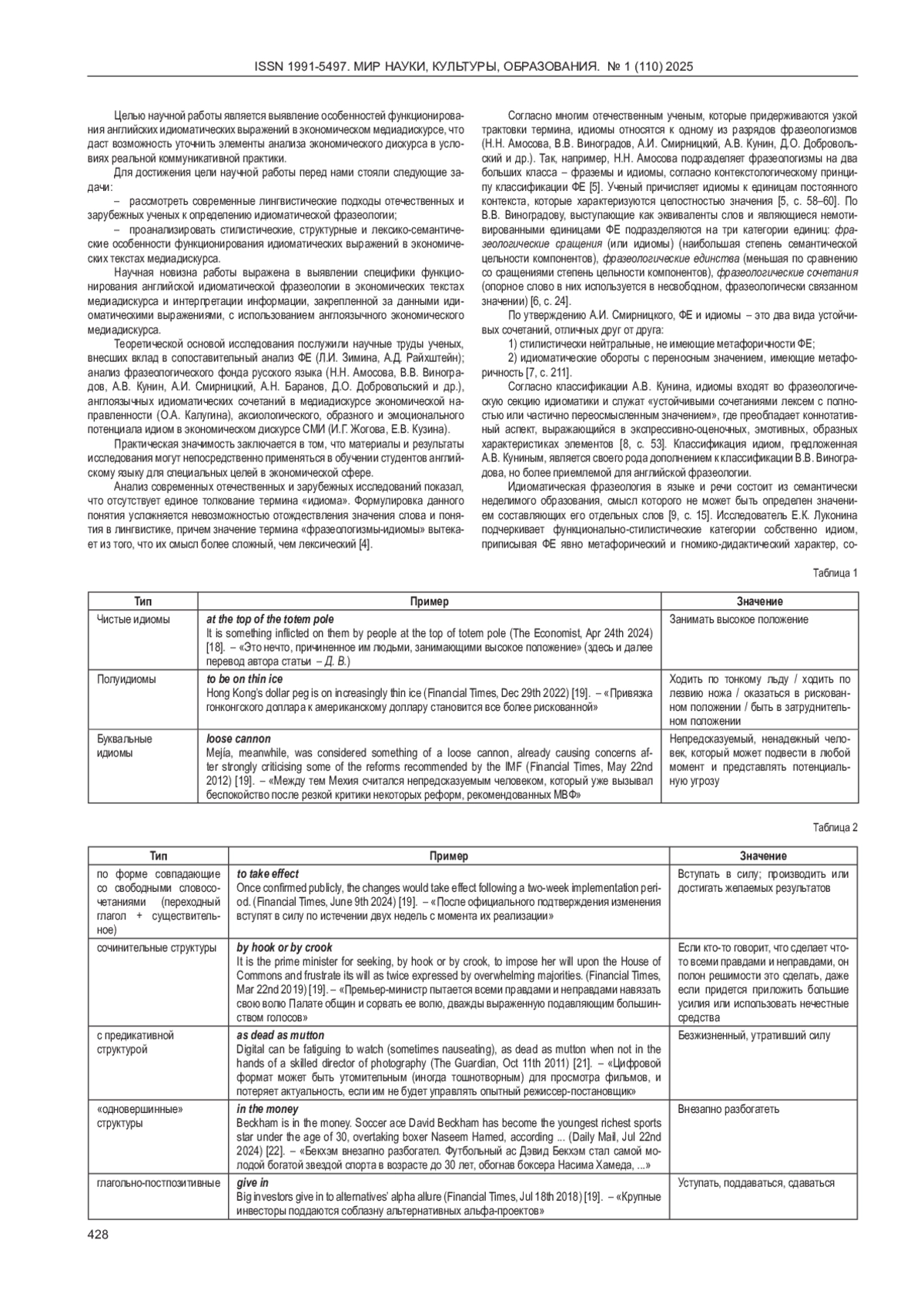 2. 	Калугина О.А. Англоязычные идиоматические сочетания в медиадискурсе экономической направленности. Филологические науки. Вопросы теории и практики. 2018; № 12-3 (90): 525-529. EDN: VNULMW