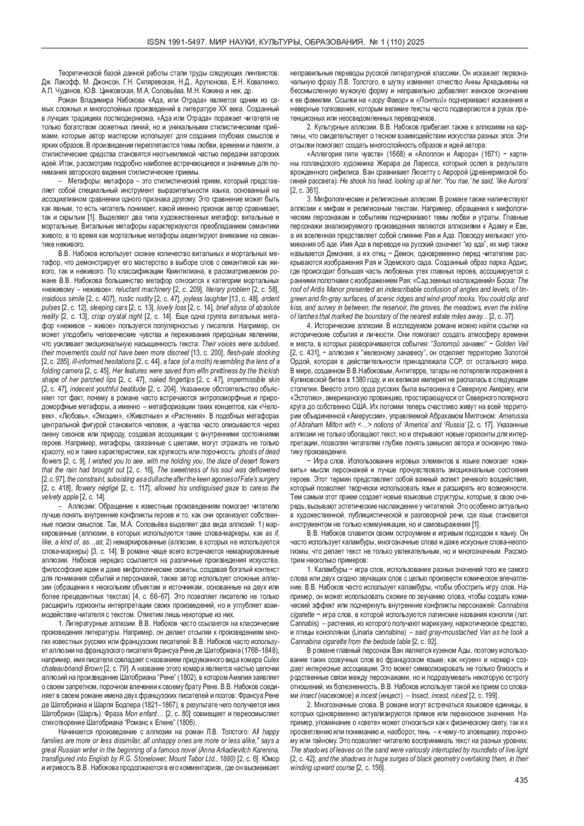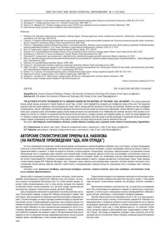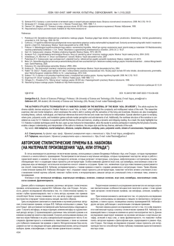 В статье анализируются различные стилистические приемы, используемые в романе Владимира Набокова «Ада, или Отрада», которые подчеркивают сложность и многослойность произведения. Рассматриваются витальные и мортальные метафоры, которые подчеркивают мастерство автора в работе с семантикой живого и неживого. A также исследуются аллюзии, которые включают литературные, культурные, мифологические и исторические отсылки, обогащающие текст и создающие новые горизонты для интерпретации. Особое внимание уделяется игре слов, где каламбуры, многозначные слова и переводные игры активизируют читательское восприятие и вносят элементы остроумия. Кроме того, нелинейная структура повествования рассматривается как способ, позволяющий В. В. Набокову экспериментировать с темами времени и памяти, создавая динамичное и интригующее чтение. Таким образом, стилистические приемы В. В. Набокова обогащают текст, открывают новые горизонты для интерпретации, позволяют читателю активно участвовать в восстановлении полной картины событий, помогают глубже понять и интерпретировать замысел автора его уникальный стиль и ключевые темы, элементы произведения.