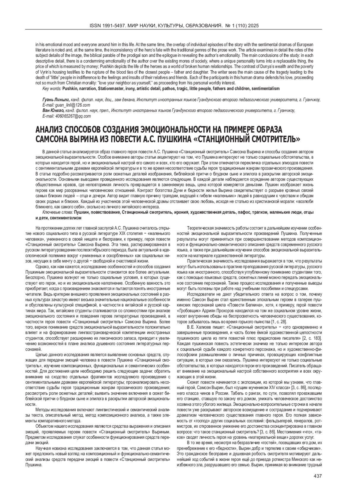 В данной статье анализируется образ главного героя повести А. С. Пушкина «Станционный смотритель» Самсона Вырина и способы создания автором эмоциональной выразительности. Особое внимание авторы статьи акцентируют на том, что Пушкина интересуют не только социальные обстоятельства, в которых находится герой, но и эмоциональный настрой его самого и всех, кто его окружает. При этом отмечается перекличка отдельных эпизодов повести с сентиментальными драмами европейской литературы и в то же время несоответствие судьбы героя традиционным жанрам прозаического произведения. В статье подробно рассматриваются роли сюжетных деталей изображения, библейской притчи о блудном сыне и эпилога в раскрытии авторской эмоциональности. Основными выводами проведенного исследования являются следующие. В каждой детали наблюдается осуждение автором существующих общественных нравов, где неповторимая личность превращается в заменяемую вещь, цена которой измеряется деньгами. Пушкин изображает жизнь героев как мир разорванных человеческих отношений. Контраст богатства Дуни и бедности жилья Вырина свидетельствует о разрыве кровных связей самых близких людей - отца и дочери. Автор видит главную причину трагедии, ведущей к гибели «маленьких» людей в равнодушии к чувствам и обидам своих родных и близких. Каждый из участников этой человеческой драмы отстаивает свою любовь, исходя не столько из христианской морали: «возлюби ближнего, как самого себя», сколько из личного житейского интереса.