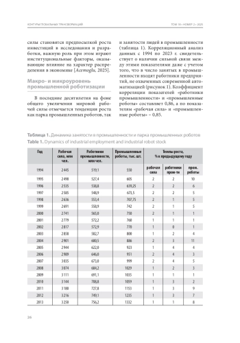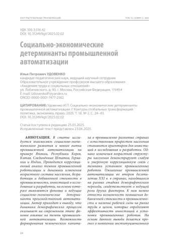 В статье исследуется взаимосвязь социально-экономического развития и нового витка промышленной автоматизации на примере Японии, Республики Корея, Китая, Соединённых Штатов, Германии и Индии. Проводится корреляционный анализ темпов промышленной роботизации и динамики изменения возрастного состава населения, безработицы и добавленной стоимости в промышленности, инвестиций в исследования и разработки, на основе которого выявляются фоновые и ведущие социально-экономические детерминанты производственной автоматизации. Автор приходит к выводу, что динамика демографических процессов оказывает на современном этапе фоновое влияние на темпы промышленной автоматизации. Возможность формирования человеческого капитала в промышленно развитых странах с естественным приростом населения становится ориентиром для инвестиций в исследования и разработки. Однако изменения возрастной структуры населения демонстрируют слабую и умеренную корреляционную связь с темпами установок промышленных роботов. Оживление промышленной автоматизации во втором десятилетии XXI в. в странах, находящихся на разных стадиях демографического перехода, свидетельствует о ведущей роли других факторов. К ним можно отнести возможность повышения добавленной стоимости в промышленности и наличие рабочей силы на рынке труда в целом, которые определяют эффективность инвестиций в установки промышленных роботов. На основе данного вывода делается прогноз о появлении институционального фактора, повышение значимости которого будет приводить к снижению темпов инвестиций в автоматизацию промышленности.