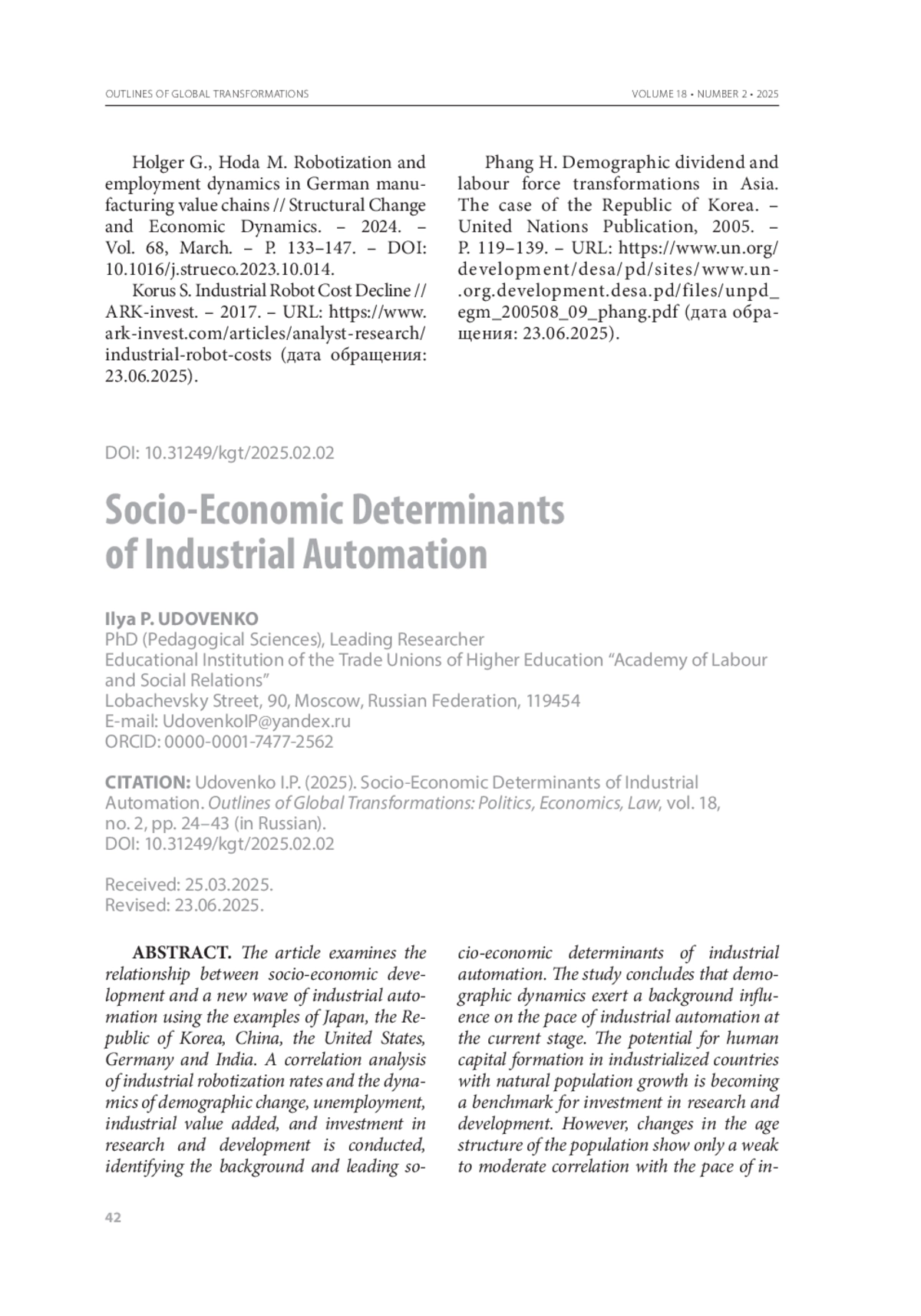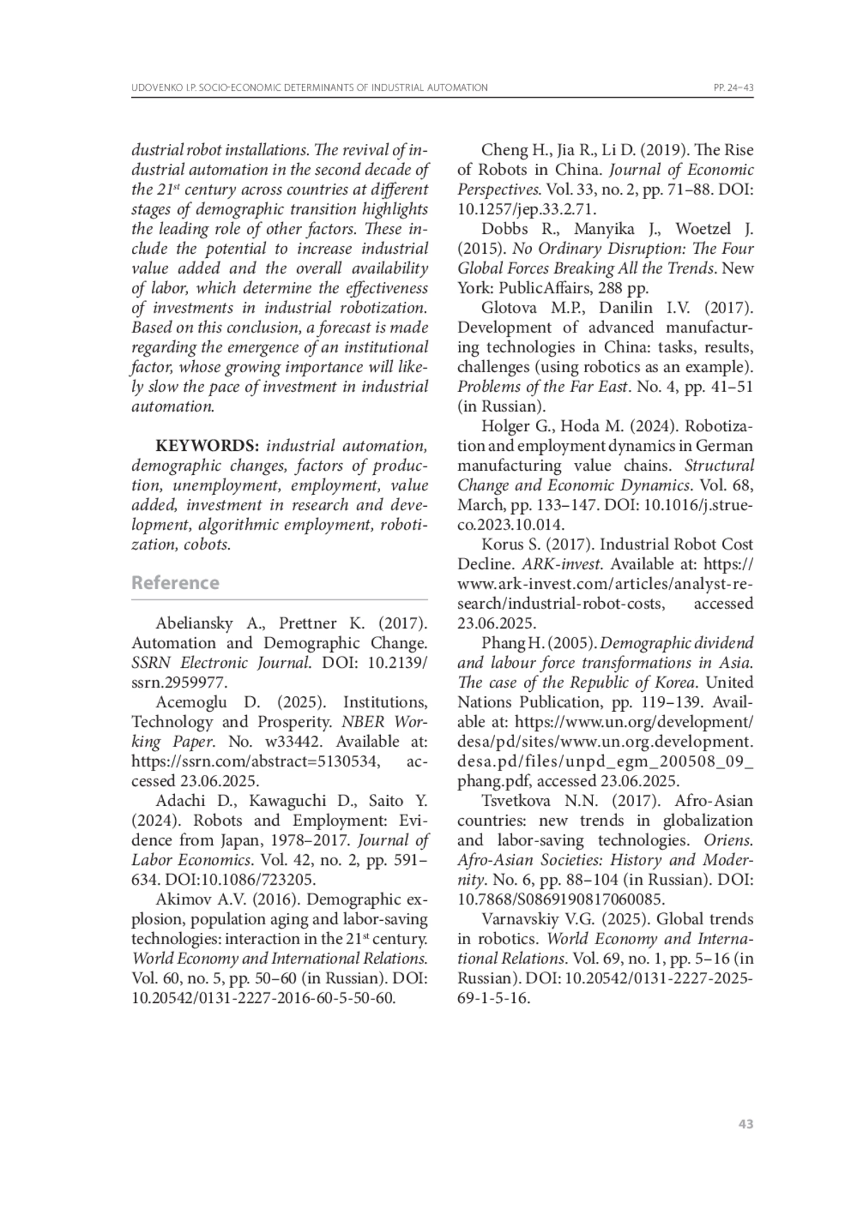 5. Abeliansky A., Prettner K. Automation and Demographic Change // SSRN Electronic Journal. - 2017. − https://doi.org/10.2139/ssrn.2959977.