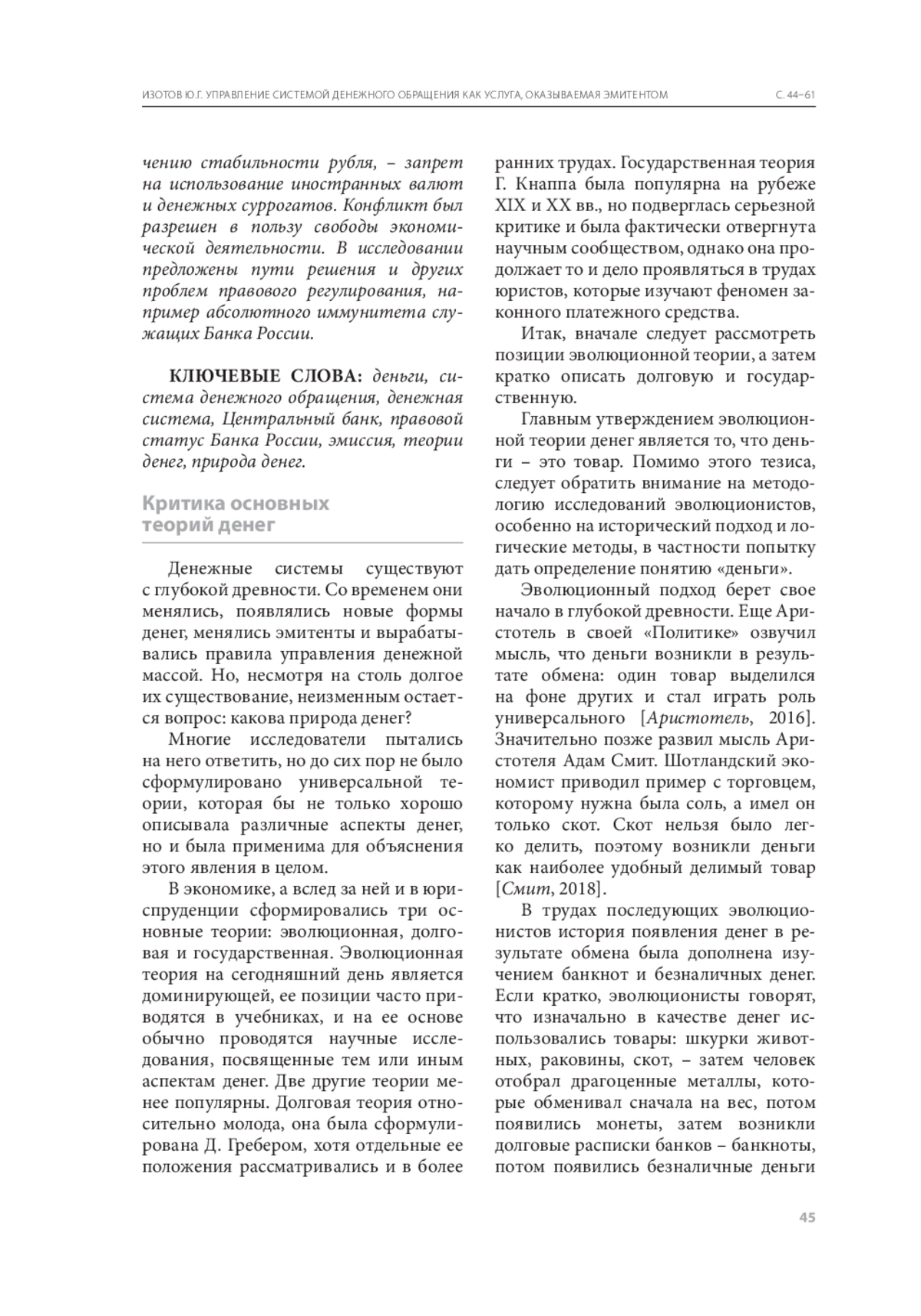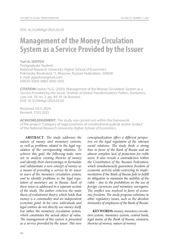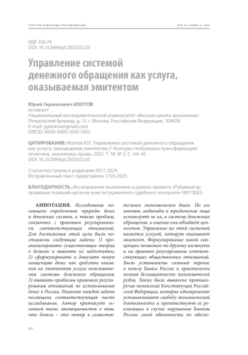 Исследование посвящено определению природы денег и денежных систем, а также проблем, связанных с правовым регулированием соответствующих отношений. Для достижения этой цели были поставлены следующие задачи: 1) проанализировать существующие теории о деньгах и выявить их недостатки; 2) сформулировать и доказать новую концепцию денег как средства оказания их эмитентом услуги пользователям системы денежного обращения; 3) выявить проблемы правового регулирования отношений по использованию денег в России. Решению каждой задачи посвящена соответствующая часть исследования. Автор критикует основной тезис эволюционистов о том, что деньги – это товар и самостоятельное экономическое благо. По его мнению, индивиды и юридические лица используют не их, а систему денежного обращения, и именно она обладает ценностью. Управление же этой системой является услугой, которую оказывает эмитент. Формулирование новой концепции позволило по‑другому взглянуть и на правовое регулирование соответствующих общественных отношений. Были установлены сильный перекос в пользу Банка России и практически полная беззащитность пользователей рубля. Также было выявлено противоречие положений Конституции Российской Федерации, которые одновременно устанавливают свободу экономической деятельности и препятствуют ее реализации в случае нарушения Банком России своей обязанности по обеспечению стабильности рубля, – запрет на использование иностранных валют и денежных суррогатов. Конфликт был разрешен в пользу свободы экономической деятельности. В исследовании предложены пути решения и других проблем правового регулирования, например абсолютного иммунитета служащих Банка России.
