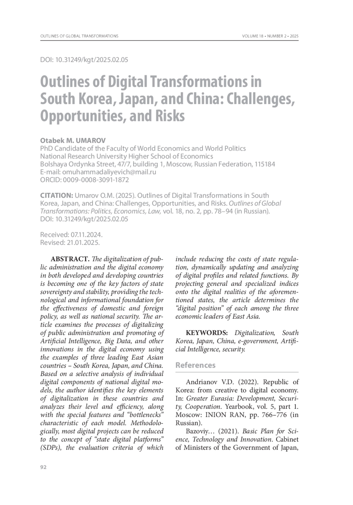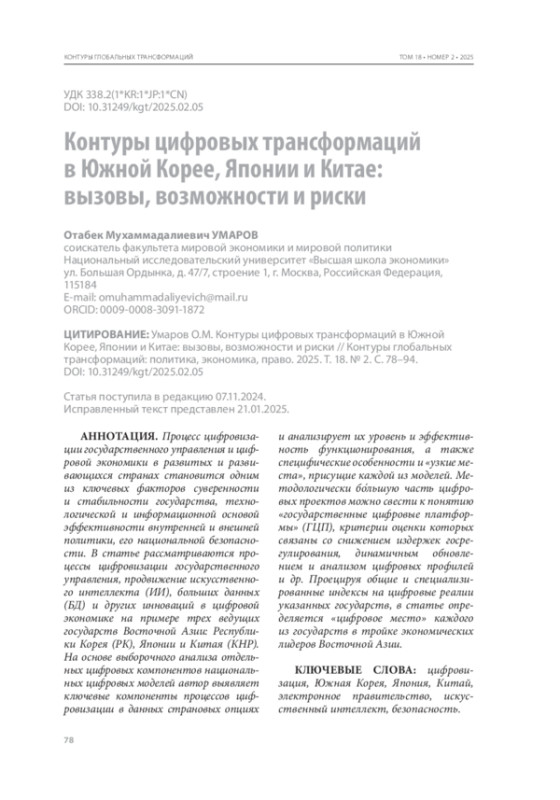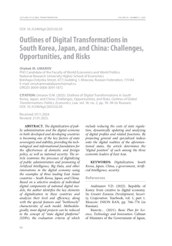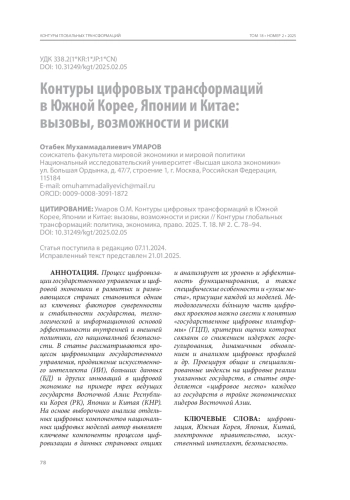Процесс цифровизации государственного управления и цифровой экономики в развитых и развивающихся странах становится одним из ключевых факторов суверенности и стабильности государства, технологической и информационной основой эффективности внутренней и внешней политики, его национальной безопасности. В статье рассматриваются процессы цифровизации государственного управления, продвижение искусственного интеллекта (ИИ), больших данных (БД) и других инноваций в цифровой экономике на примере трех ведущих государств Восточной Азии: Республики Корея (РК), Японии и Китая (КНР). На основе выборочного анализа отдельных цифровых компонентов национальных цифровых моделей автор выявляет ключевые компоненты процессов цифровизации в данных страновых опциях и анализирует их уровень и эффективность функционирования, а также специфические особенности и «узкие места», присущие каждой из моделей. Методологически бо́льшую часть цифровых проектов можно свести к понятию «государственные цифровые платформы» (ГЦП), критерии оценки которых связаны со снижением издержек госрегулирования, динамичным обновлением и анализом цифровых профилей и др. Проецируя общие и специализированные индексы на цифровые реалии указанных государств, в статье определяется «цифровое место» каждого из государств в тройке экономических лидеров Восточной Азии.