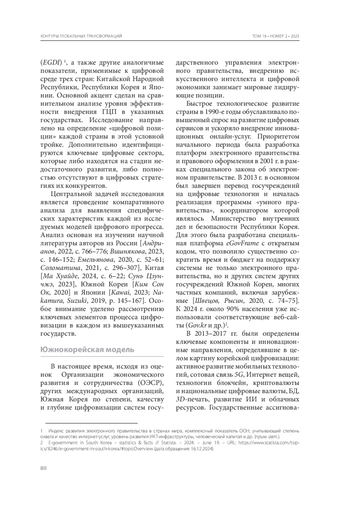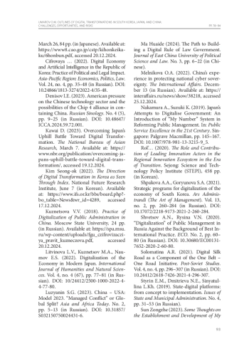 18. Ким Сон Ок. Направление цифровой трансформации Кореи через индексы = 김성옥. 지수로 본 한국 디지 털 전환의 방향 // Корейский институт исследований будущего = (사)국가미 래연구원. - 2022. - 7 июня. - Кор. яз. - URL: https://www.ifs.or.kr/bbs/board.php?bo_table=News&wr_id=4289 (дата обращения: 17.12.2024).