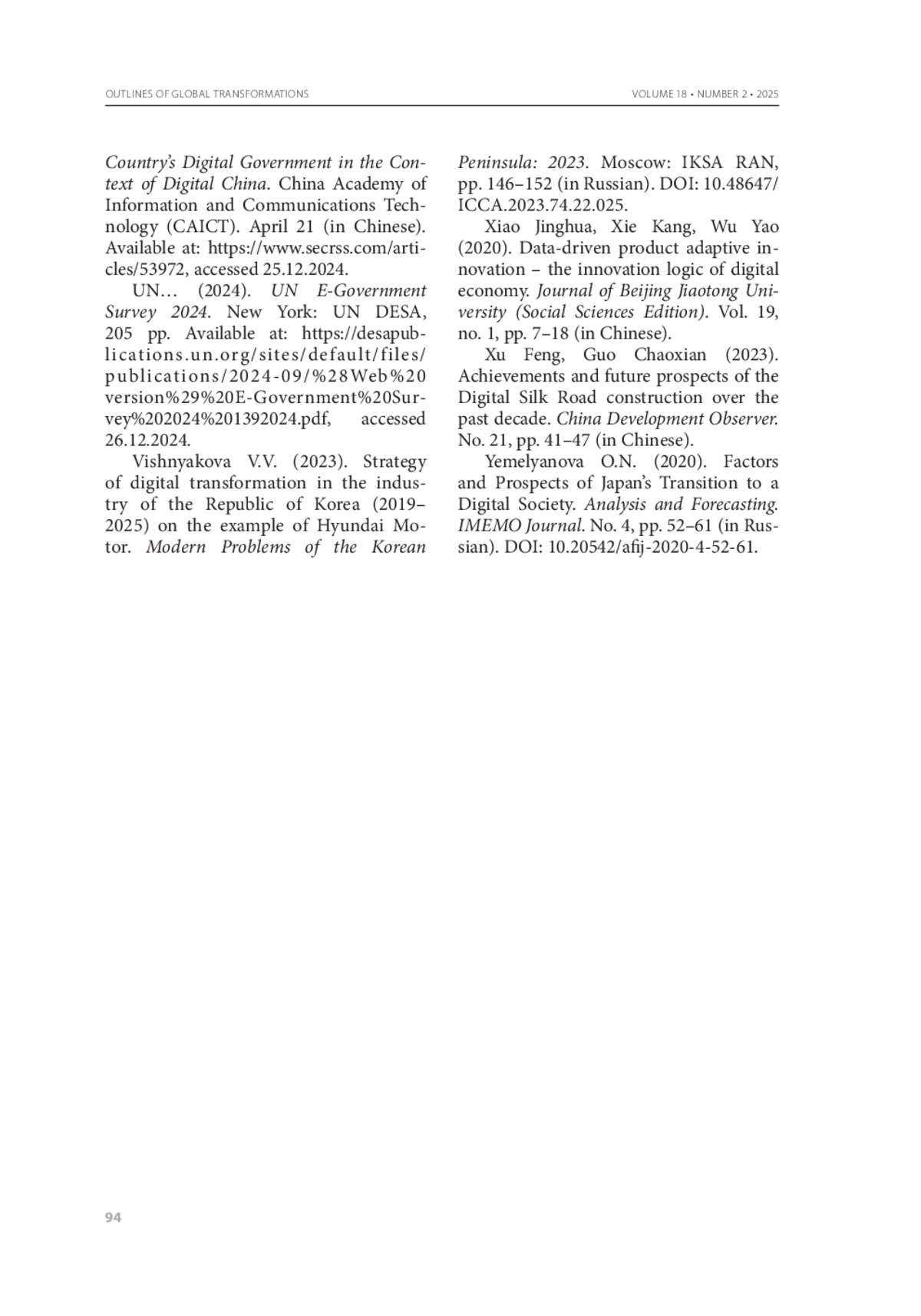 22. Сюй Фэн, Го Чаосянь. Достижения и перспективы строительства Цифрового Шёлкового пути за последние десять лет = 徐枫, 郭朝先. 数字丝绸之路建设 十年成就与未来展望 // Обзор развития Китая = 中国发展观察. - 2023. - № 21. - С. 41-47. - Кит. яз.