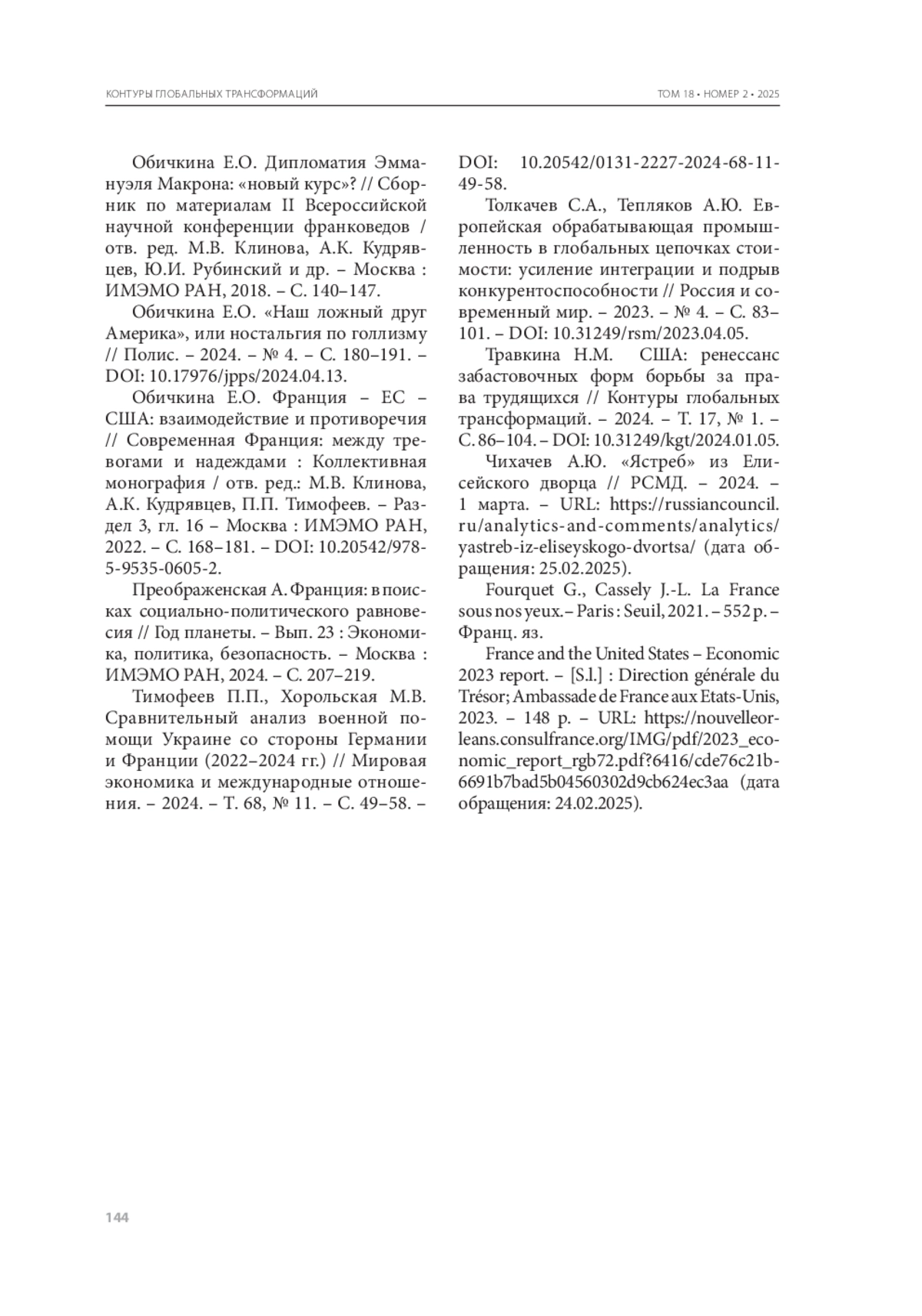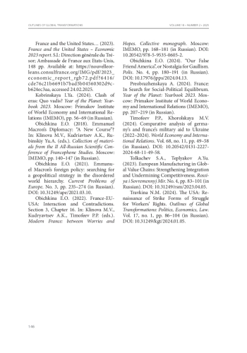 6. Обичкина Е.О. Франция - ЕС - США: взаимодействие и противоречия // Современная Франция: между тревогами и надеждами : Коллективная монография / отв. ред.: М.В. Клинова, А.К. Кудрявцев, П.П. Тимофеев. - Раздел 3, гл. 16 - Москва : ИМЭМО РАН, 2022. - С. 168-181. - https://doi.org/10.20542/978-5-9535-0605-2.