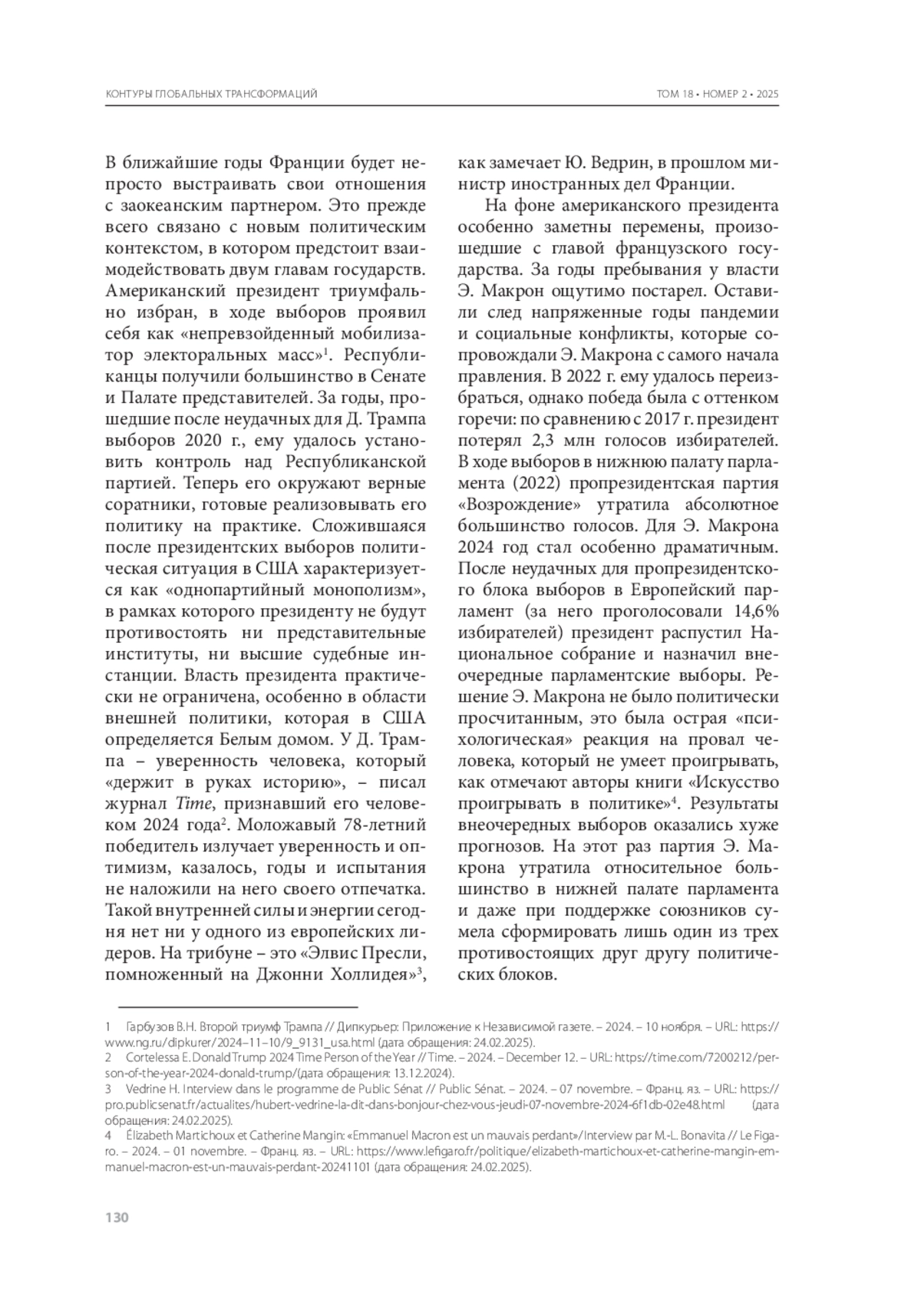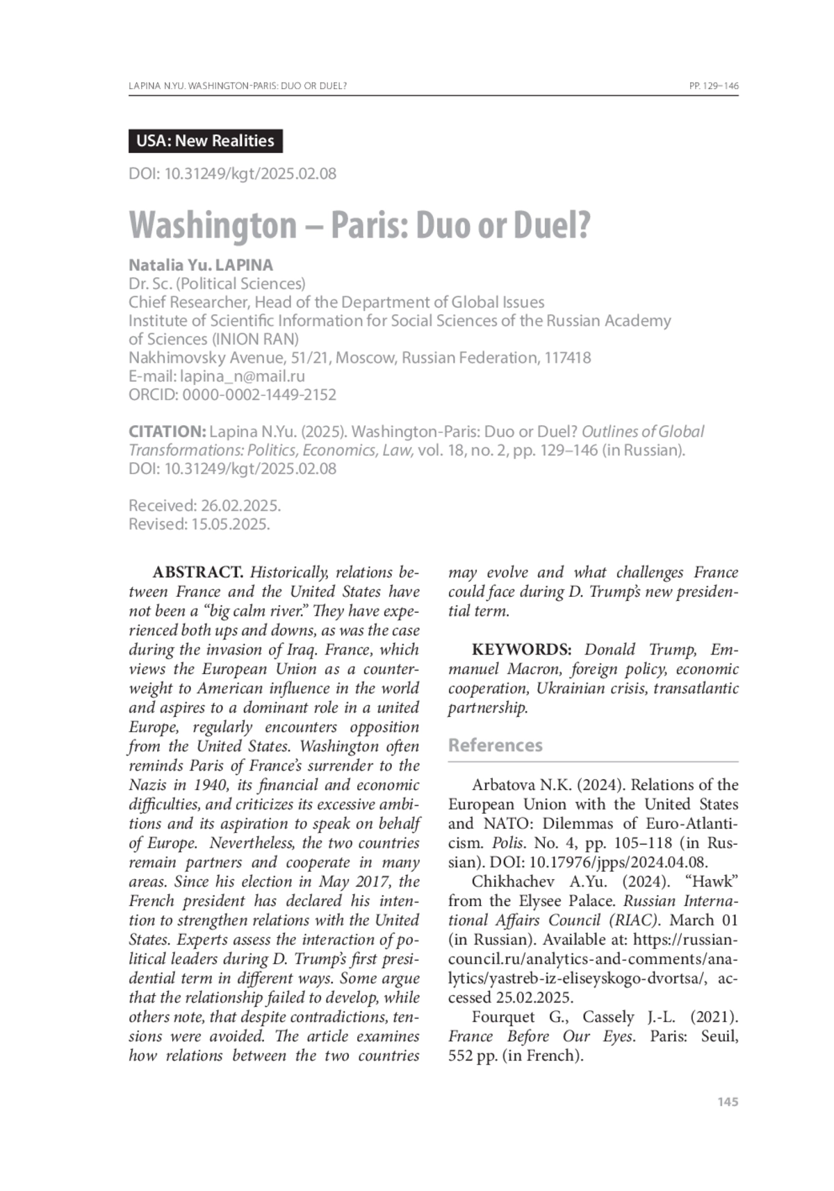 5. Обичкина Е.О. «Наш ложный друг Америка», или ностальгия по голлизму // Полис. - 2024. - № 4. - С. 180-191. - https://doi.org/10.17976/jpps/2024.04.13.