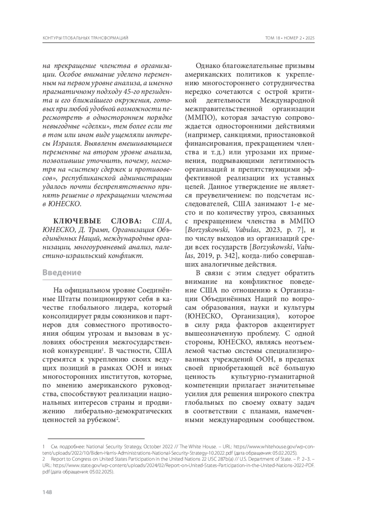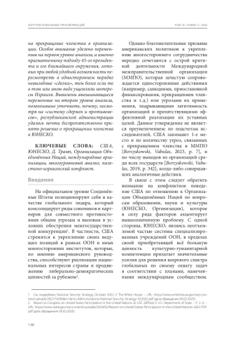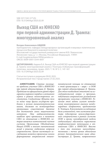 Статья посвящена проблеме участия США в ЮНЕСКО при первой администрации Д. Трампа. Продвигая на официальном уровне образ гаранта мирового порядка и активного игрока в рамках многосторонних институтов, Соединённые Штаты тем не менее чаще других государств прибегали к резким внешнеполитическим шагам, оказывая на международные организации существенное давление для достижения своих национальных интересов. Эта амбивалентность наиболее ярко проявилась в политике США по отношению к ЮНЕСКО, которая является неотъемлемой частью системы Организации Объединённых Наций (ООН) и вносит значительный вклад в решение глобальных вопросов современности. Целью настоящего исследования является прояснение логики формирования американской внешнеполитической позиции по отношению к этой организации и – шире – к ООН при первой администрации Д. Трампа. Для этого необходимо ответить на исследовательский вопрос о причинах, побудивших американское руководство прекратить членство в ЮНЕСКО. Решению этой задачи служит методология многоуровневого анализа международных конфликтов, предложенная К. Уолтцем. В результате исследования было установлено, что системные факторы (обострение межгосударственного соперничества в рамках системы ООН и кризис неолиберальной модели глобализации) обусловили нарастание конфликтогенного потенциала в отношениях США и ЮНЕСКО. Вместе с тем они оказались малосодержательными с точки зрения объяснения резкого дипломатического шага администрации Д. Трампа, направленного на прекращение членства в организации. Особое внимание уделено переменным на первом уровне анализа, а именно прагматичному подходу 45‑го президента и его ближайшего окружения, готовых при любой удобной возможности пересмотреть в одностороннем порядке невыгодные «сделки», тем более если те в том или ином виде ущемляли интересы Израиля. Выявлены вмешивающиеся переменные на втором уровне анализа, позволившие уточнить, почему, несмотря на «систему сдержек и противовесов», республиканской администрации удалось почти беспрепятственно принять решение о прекращении членства в ЮНЕСКО.