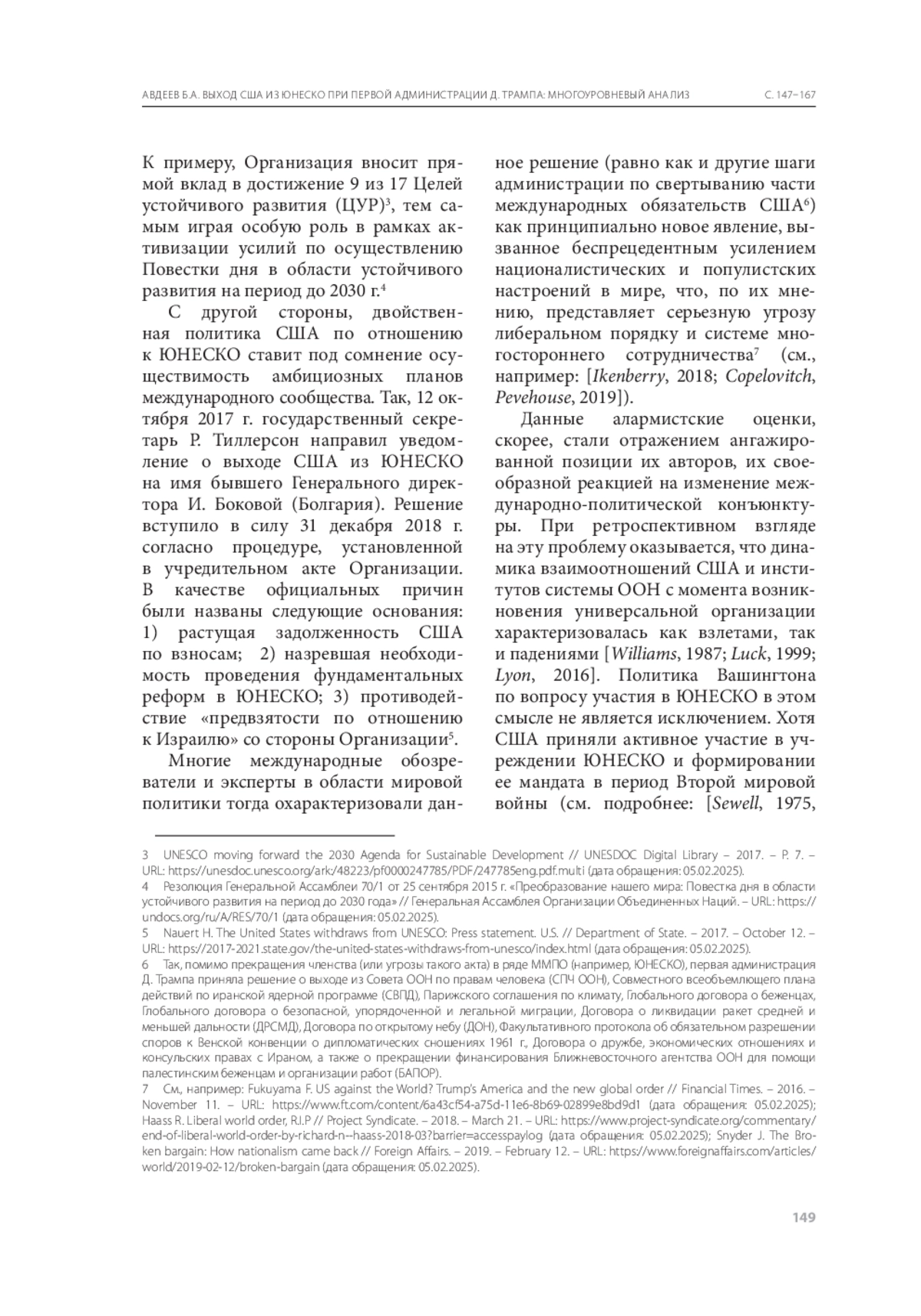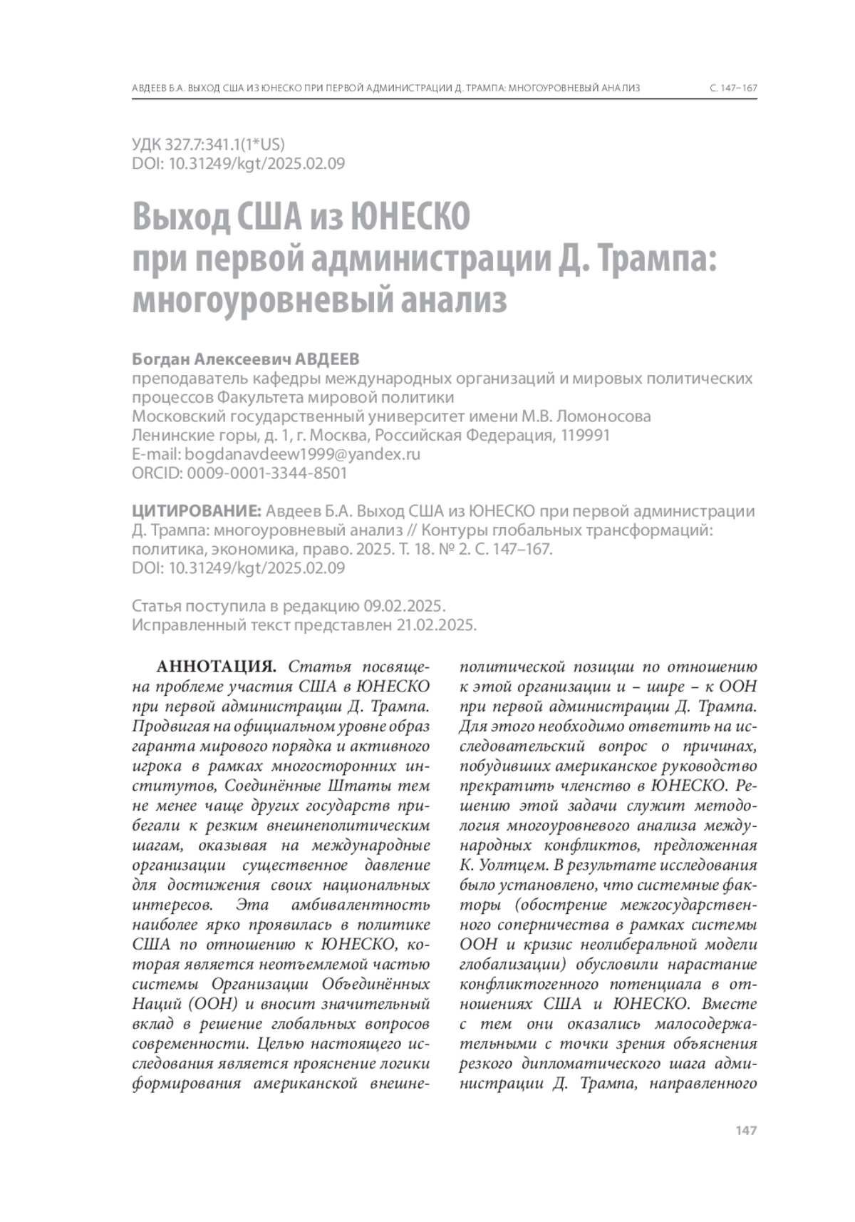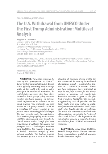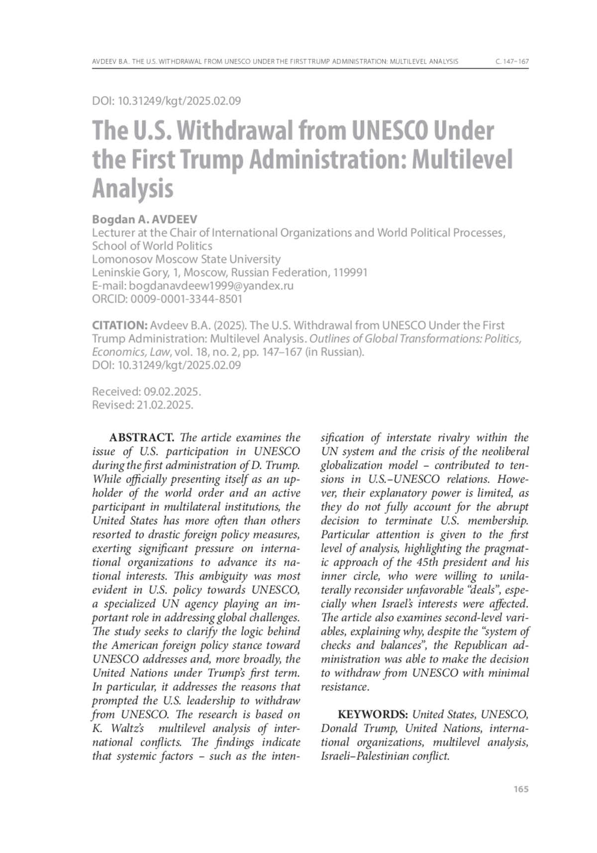 1. Авдеев Б.А. Выход США из ЮНЕСКО при администрации Р. Рейгана: многоуровневый анализ // Вестник Московского университета. Серия XXV. Международные отношения и мировая политика. - 2024. - Т. 16, № 4. - С. 169- 224. - https://doi.org/10.48015/2076-7404-2024-16-4-169-224.