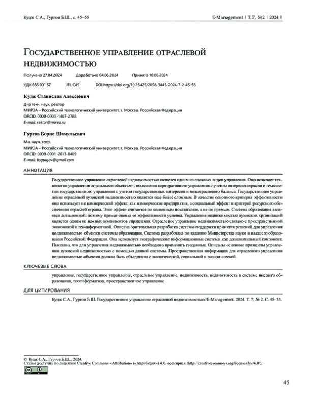 Государственное управление отраслевой недвижимостью является одним из сложных видов управления. Оно включает технологии управления отдельными объектами, технологии корпоративного управления с учетом интересов отрасли и технологии государственного управления с учетом государственных интересов и межотраслевого баланса. Государственное управление отраслевой вузовской недвижимостью является еще более сложным. В качестве основного критерия эффективности оно использует не коммерческий эффект, как коммерческие предприятия, а социальный эффект и критерий ресурсного обеспечения отраслей страны. Этот эффект считается по косвенным показателям, а не по прямым. Система образования является дотационной, поэтому прямая оценка ее эффективности условна. Управление недвижимостью вузовских организаций является одним из важных компонентов управления. Отраслевое управление недвижимостью связано с пространственной экономикой и геоинформатикой. Описана оригинальная разработка системы поддержки принятия решений для управления недвижимостью объектов системы образования. Система разработана по заданию Министерства науки и высшего образования Российской Федерации. Она использует географические информационные системы как дополнительный компонент. Показано, что для управления недвижимостью необходимо применять геоданные. Описаны основные принципы управлении вузовской недвижимостью с помощью данной системы. Пространственная информация для отраслевого управления недвижимостью объектов должна быть объединена с экологической, социальной и экономической.