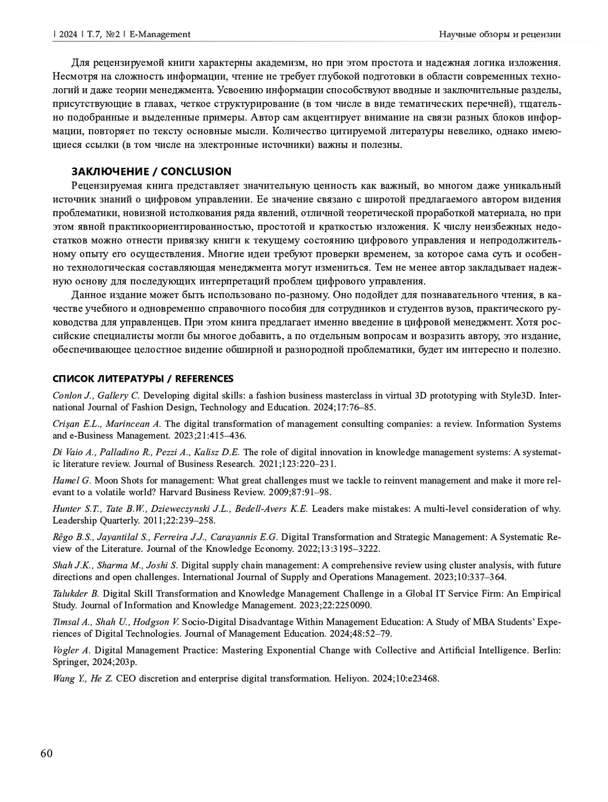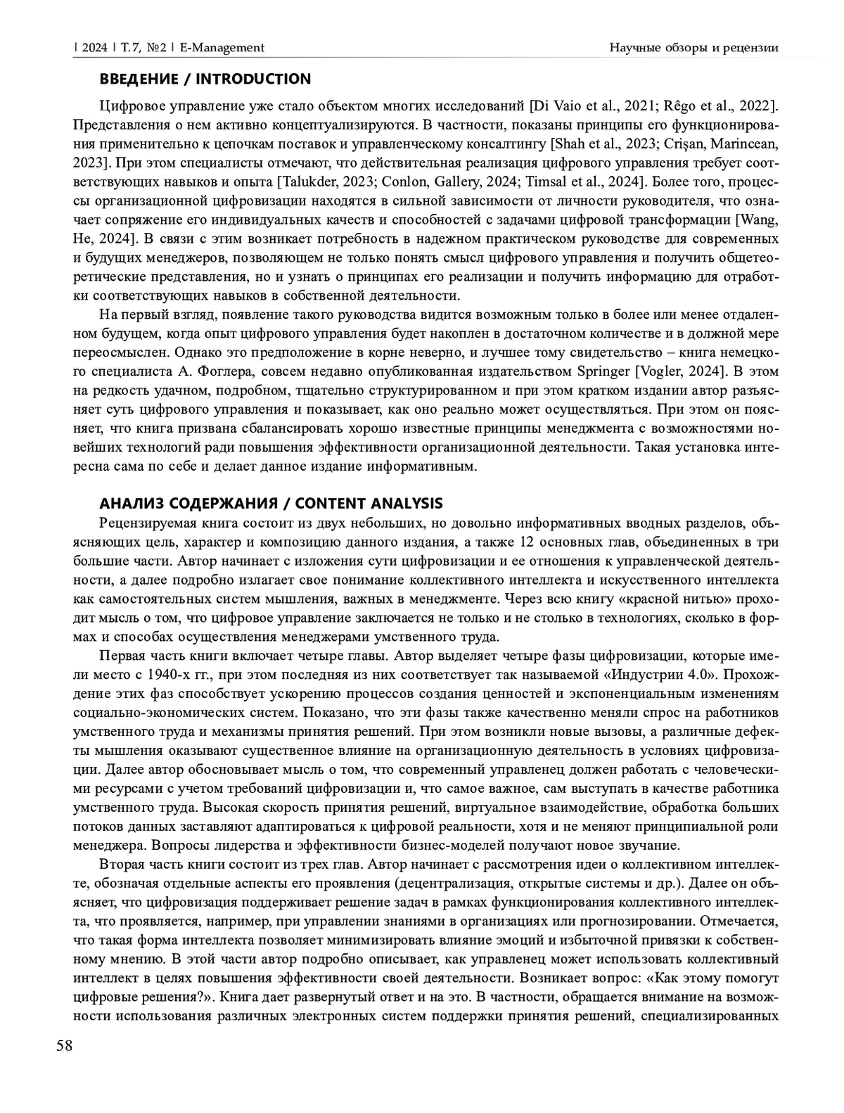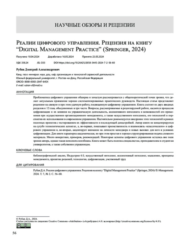 Проблематика цифрового управления обширна и зачастую рассматривается с общетеоретической точки зрения, что делает актуальным проявление хорошо систематизированных практических руководств. Настоящая статья представляет рецензию на свежую и при этом удачную работу, посвященную цифровому управлению. Книга состоит из двух вводных разделов и 12 глав, объединенных в три части. Вопросы, рассматриваемые в рецензируемой работе, касаются процессов цифровизации и их влияния на управленческую деятельность, коллективного интеллекта и возможностей его применения при осуществлении организационного менеджмента, а также искусственного интеллекта, его технологий и перспектив их использования в современном управлении. Настоятельно рекомендуется внедрение этих технологий в рамках пилотных проектов с тестированием их эффективности и последующей донастройкой. Автор книги не концентрируется на сугубо технологических аспектах, а, во-первых, показывает преемственность и взаимосвязь «классического» и цифрового управления и, во-вторых, акцентирует внимание на личности менеджера и новых вызовах для него в условиях цифровизации. Для книги характерна академическая, но при этом простая и хорошо структурированная подача сложного материала. Много конкретики, примеров, рекомендаций. Некоторые аспекты цифрового управления остались вне поля зрения автора, однако такая неполнота неизбежна. Книга может быть полезна специалистам, преподавателям и студентам университетов, а также собственно управленцам.