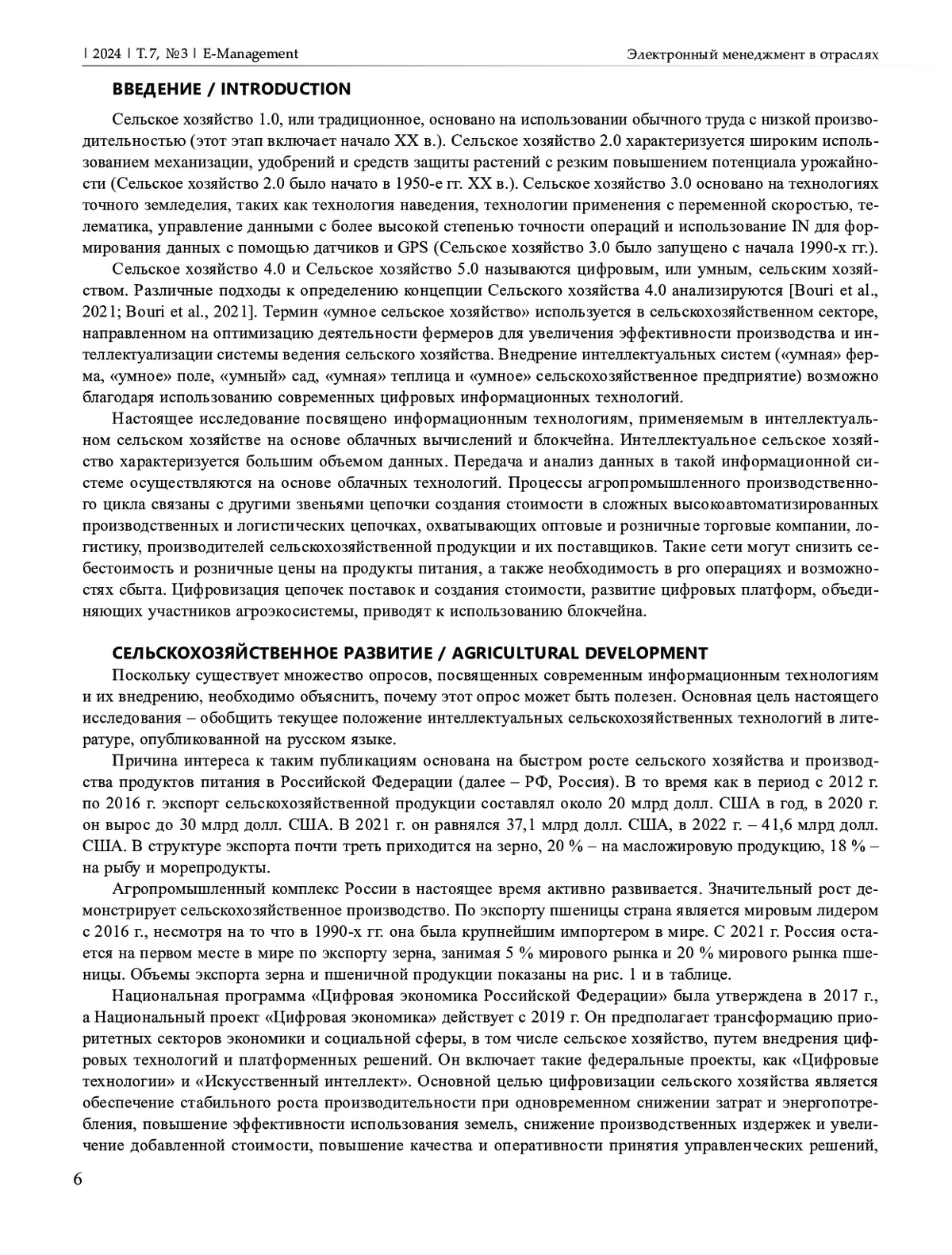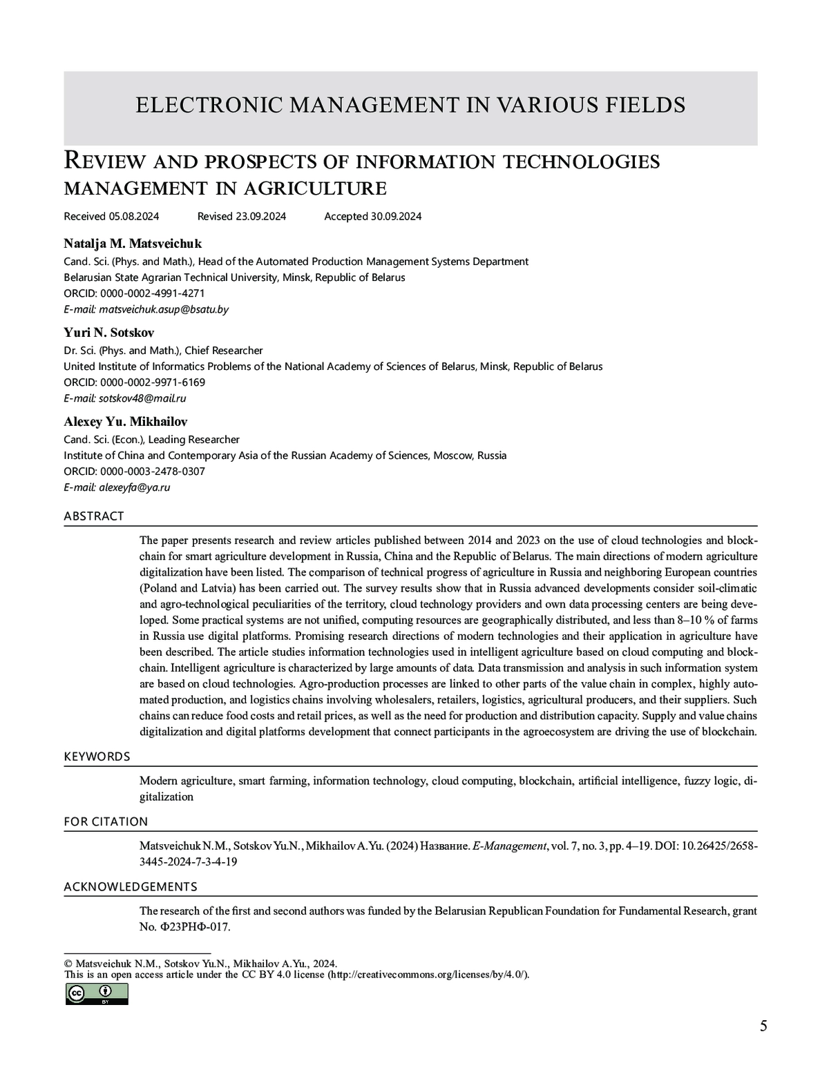 Представлены исследования и обзорные статьи, опубликованные в период с 2014 г. по 2023 г., посвященные использованию облачных технологий и блокчейна для развития интеллектуального сельского хозяйства в Российской Федерации (далее – РФ, Россия), Китае и Белоруссии. Перечислены основные направления цифровизации современного сельского хозяйства. Проведено сравнение технического прогресса сельского хозяйства в РФ и соседних европейских странах (Польше и Латвии). Результаты опроса показывают, что в РФ передовые разработки учитывают почвенно-климатические и агротехнологические особенности территории, развиты поставщики облачных технологий и собственные центры обработки данных. Отмечено, что некоторые практические системы не унифицированы, вычислительные ресурсы географически распределены, а цифровыми платформами в РФ пользуются менее 8–10 % фермерских хозяйств. Описаны перспективные направления исследований современных технологий и их применения в сельском хозяйстве. Настоящее исследование посвящено информационным технологиям, применяемым в интеллектуальном сельском хозяйстве на основе облачных вычислений и блокчейна. Для интеллектуального сельского хозяйства характерны большие объемы данных. Передача и анализ данных в такой информационной системе основаны на облачных технологиях. Процессы агропроизводственного цикла связаны с другими звеньями цепочки создания стоимости в сложных высокоавтоматизированных производственных и логистических цепочках, охватывающих оптовые и розничные торговые компании, логистику, сельскохозяйственных производителей и их поставщиков. Такие цепочки могут снизить себестоимость и розничные цены на продукты питания, а также потребность в производственных и сбытовых мощностях. Цифровизация цепочек поставок и создания стоимости, развитие цифровых платформ, объединяющих участников агроэкосистемы, приводят к использованию блокчейна.