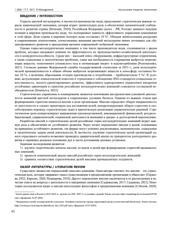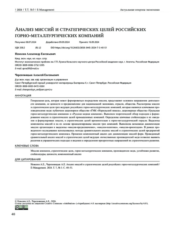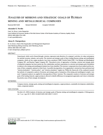 Генеральная цель, которая может формироваться посредством миссии, представляет основное направление деятельности компании, ее ценности и предназначение для национальной экономики, отрасли, общества. Рассмотрены миссии и стратегические цели трех ведущих российских горно-металлургических компаний, которые являются ключевыми производителями меди: публичное акционерное общество «ГМК «Норильский никель», акционерные общества «Уральская горно-металлургическая компания» и «Русская медная компания». Выполнен теоретический обзор подходов к формированию миссии и стратегических целей промышленных компаний. Определены ключевые стейкхолдеры и их ожидания в формулировках миссии, и стратегических целей применительно к горно-металлургической отрасли. Выделены компоненты миссий и на их основе проанализированы миссии трех компаний. Выполнена возможная декомпозиция миссии организации и выделены «миссия-предназначение», «миссия-политика», «миссия-ориентация». В рамках проведенного исследования использовались методы сравнительного анализа миссий и стратегических целей предприятий горно-металлургического комплекса. Применен компонентный анализ для декомпозиции миссий фирм. Проведенный сравнительный анализ миссий и стратегических целей ведущих отечественных производителей меди позволил выявить различия в управленческих подходах и видении к определению приоритетных направлений их стратегического развития.