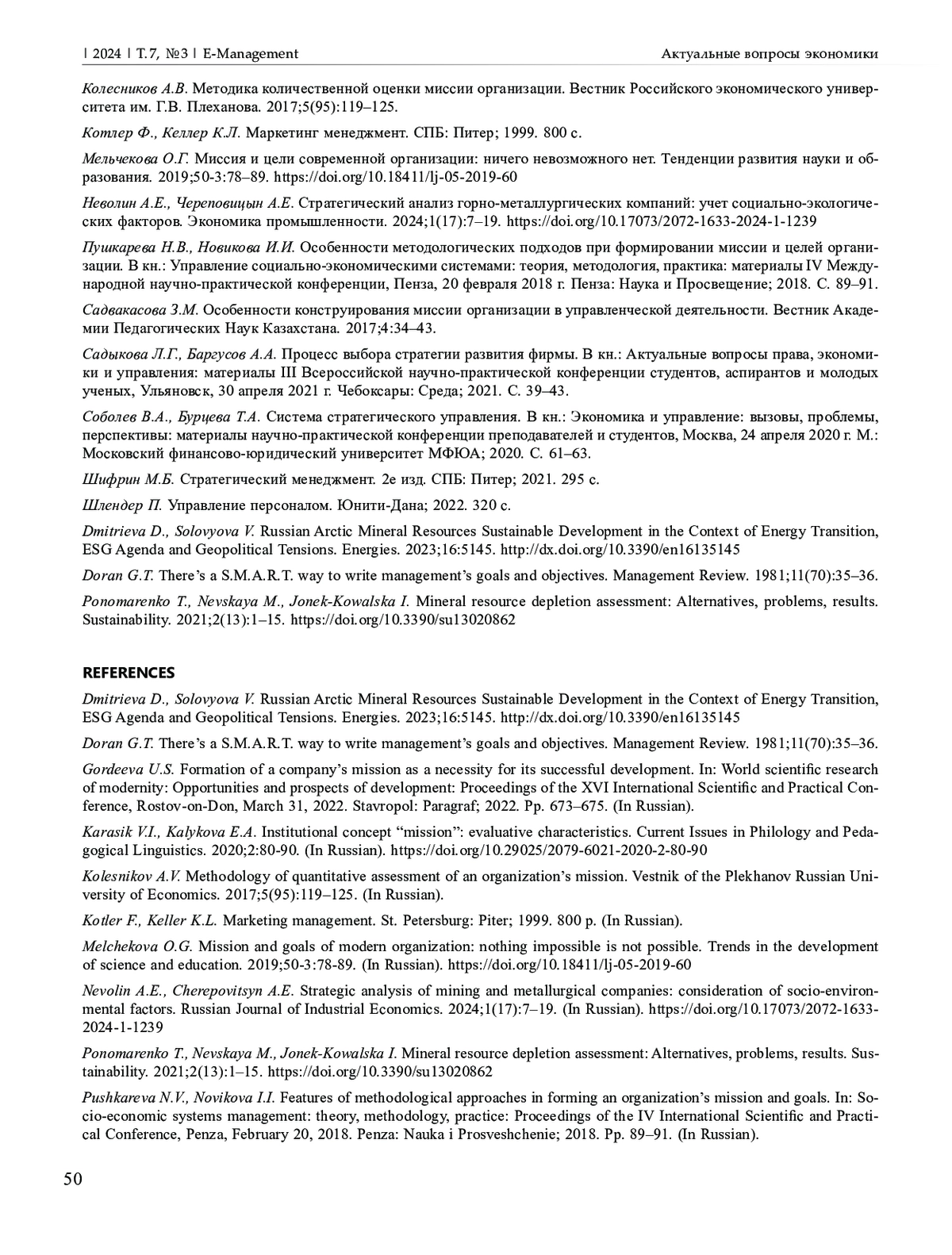 3. Колесников А.В. Методика количественной оценки миссии организации. Вестник Российского экономического университета им. Г.В. Плеханова. 2017;5(95):119-125.