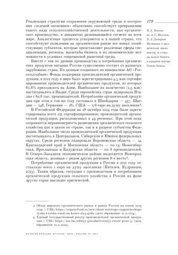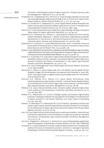 3. 	Волкова И. А., Леушкина В. В., Погребцова Е. А. (2022). Органическое сельское хозяйство как драйвер развития зеленой экономики // Креативная экономика. Т. 16. № 6. С. 2381-2394.  EDN: XXNUAN