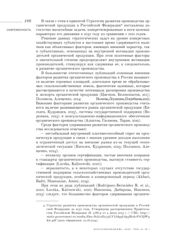 4. 	Воронина Н. П. (2023). Государственная поддержка органического сельского хозяйства // Сельское хозяйство. № 1. С. 49-50.  EDN: UCDOWO