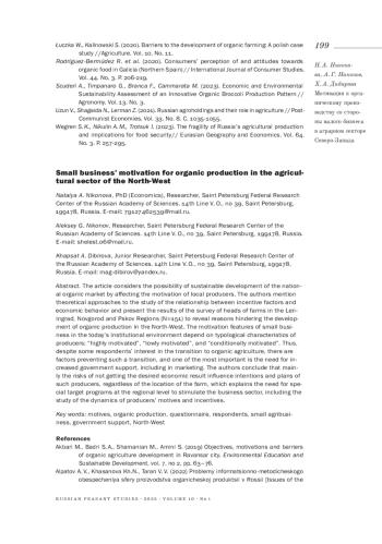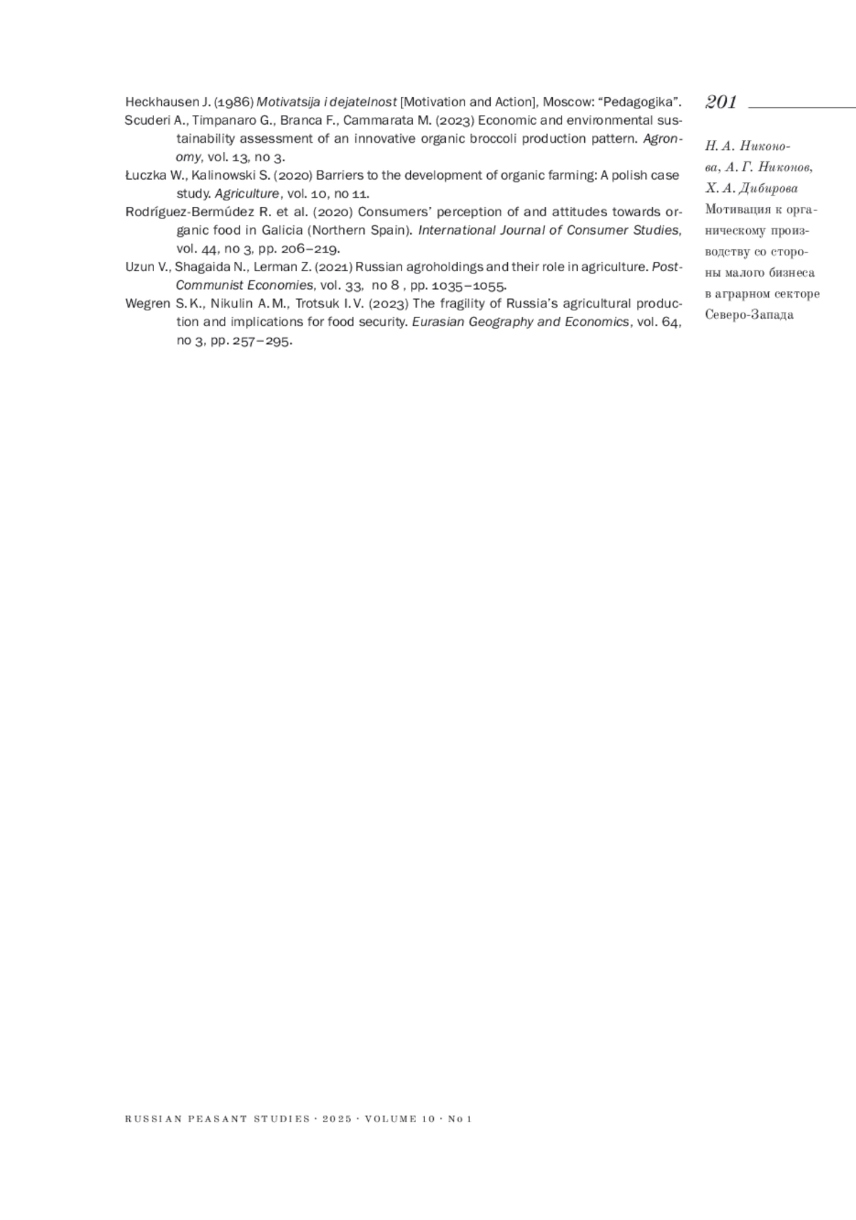11. 	Никонова Н. А., Дибирова Х. А., Никонов А. Г. (2023). Факторы формирования рынка сельскохозяйственной органической продукции в условиях Северо-Запада // АПК: экономика, управление. № 10. С. 78-86.