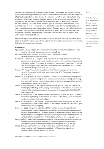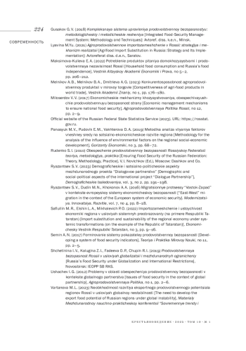 1. Аганбегян А. Г. (2010). Заметки о продовольственной безопасности России // Мир агробизнеса. № 2. C. 16-21. EDN: NDXXEX