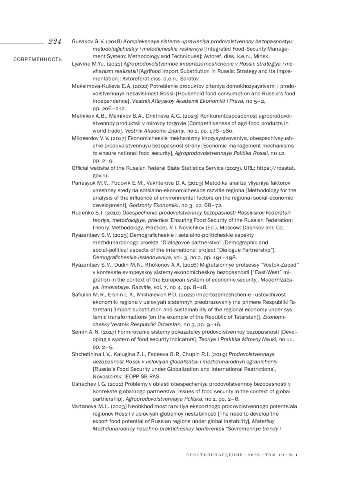 9. Вартанова М. Л. (2024). Продовольственная безопасность регионов России в условиях глобальной нестабильности: дисс. … д-ра экон. наук (5.2.3). Москва. EDN: BXWZEG