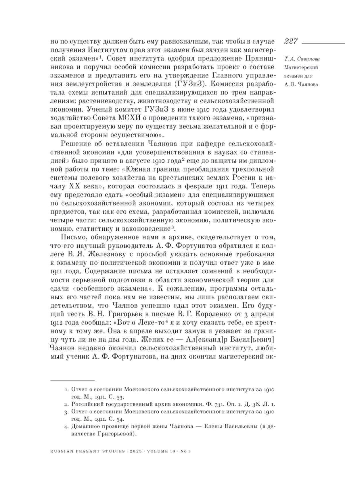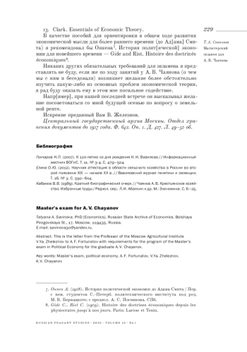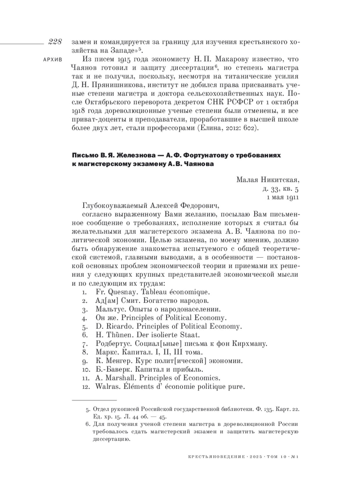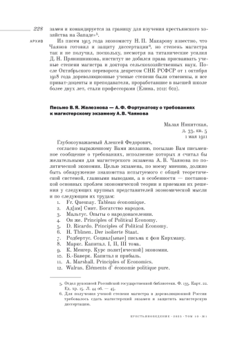 В публикации представлено письмо профессора Московского сельскохозяйственного института В. Я. Железнова А. Ф. Фортунатову с требованиями к программе магистерского экзамена по политической экономии для выпускника института А. В. Чаянова.