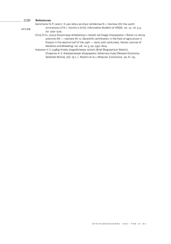1. 	Гончаров Н. П. (2007). К 120-летию со дня рождения Н. И. Вавилова // Информационный вестник ВОГиС. Т. 11. № 3-4. С. 479-524. EDN: KNXABR