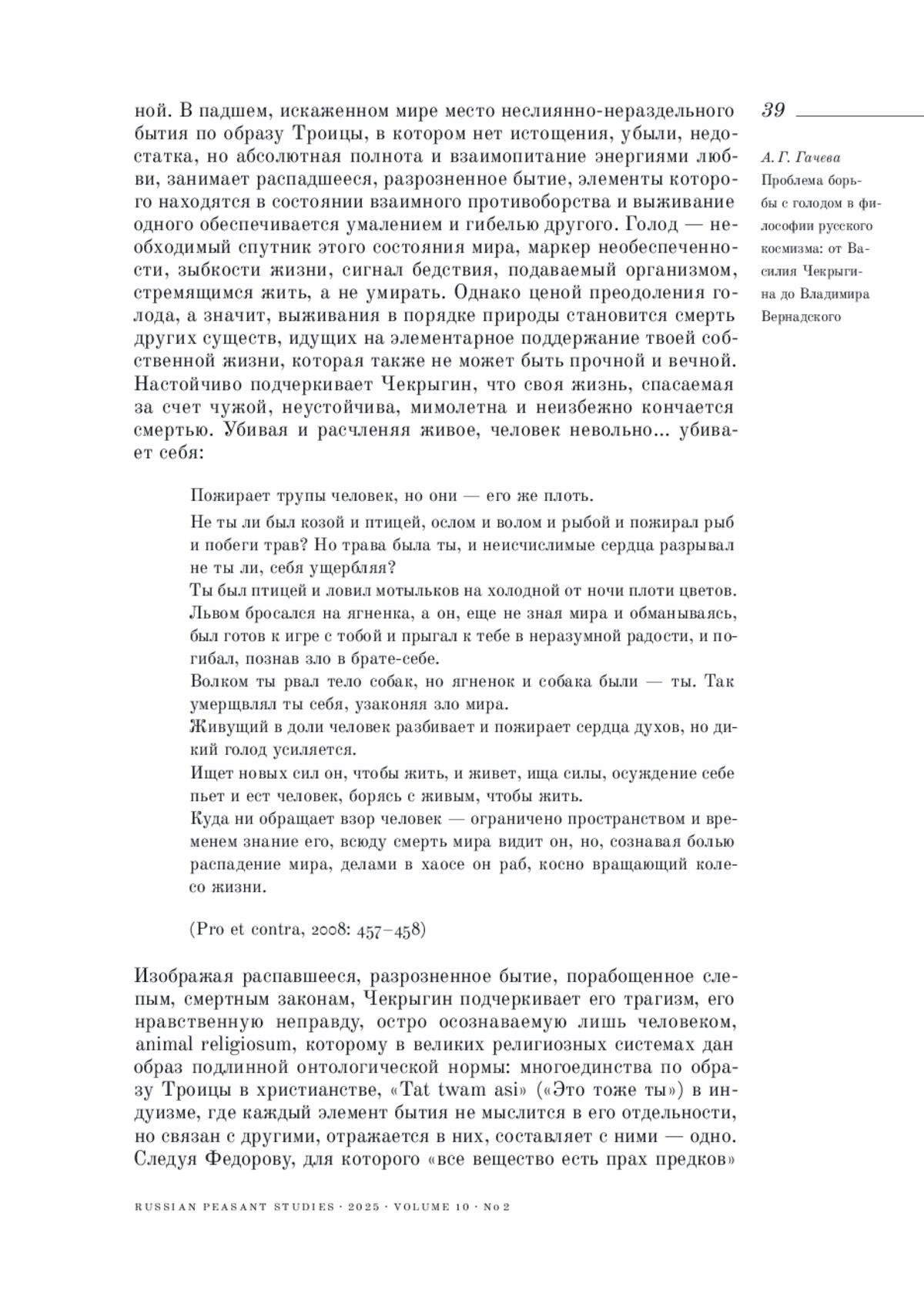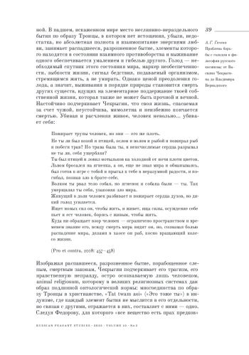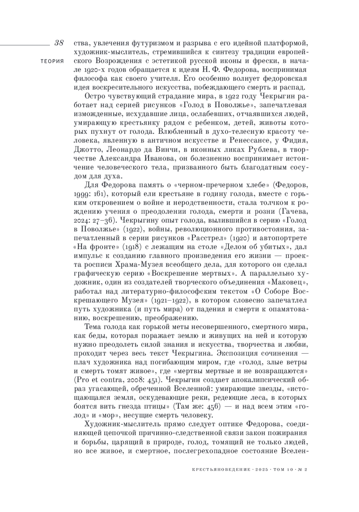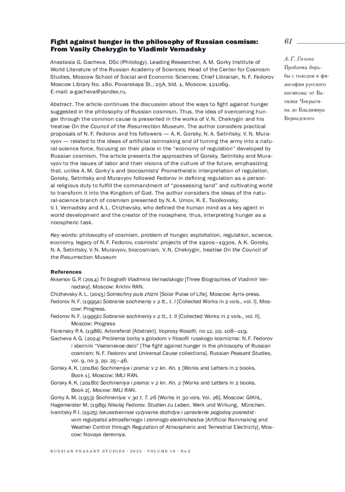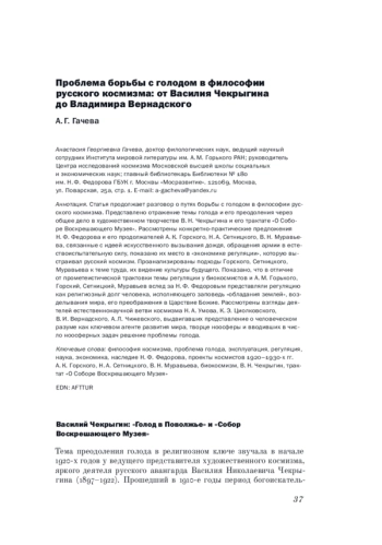 4. 	Гачева А. Г. (2024). Проблема борьбы с голодом в философии русского космизма: Н. Ф. Федоров и сборники “Вселенское дело” // Крестьяноведение. Т. 9. № 3. С. 25-46.  EDN: QEVLNB