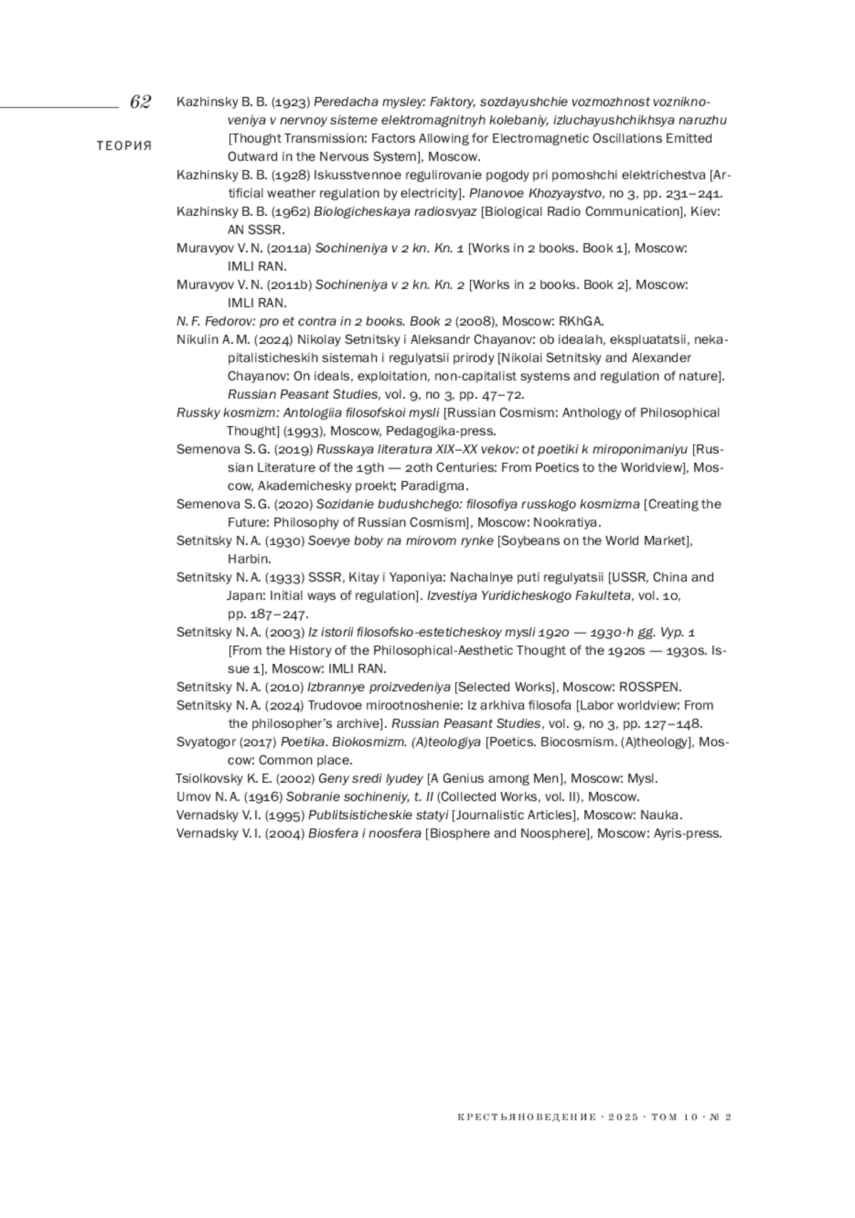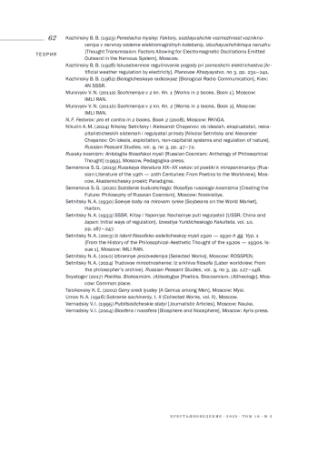 14. 	Никулин А. М. Николай Сетницкий и Александр Чаянов: об идеалах, эксплуатации, некапиталистических системах и регуляции природы // Крестьяноведение. 2024. Т. 9. № 3. С. 47-72.  EDN: QXBICP