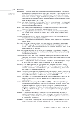 20. Колесникова О. В. (2023). Статистика животноводства в дореволюционной России // Двадцать четвертые Петровские чтения: Материалы Всероссийской научной конференции с международным участием 16-17 ноября 2022 г. СПб.: Русская христианская гуманитарная академия им. Ф. М. Достоевского. С. 322-329. EDN: AFVGAF