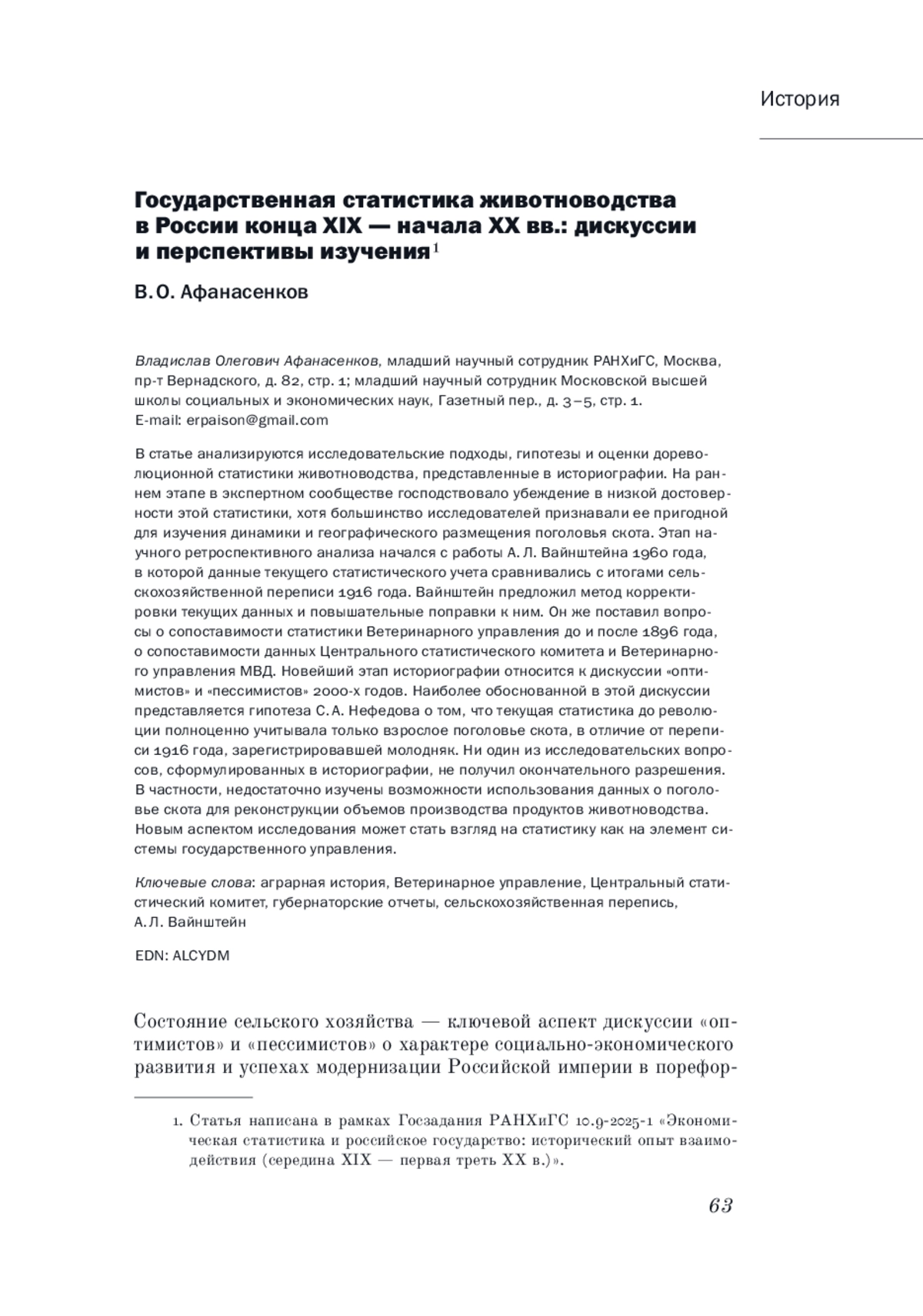 В статье анализируются исследовательские подходы, гипотезы и оценки дореволюционной статистики животноводства, представленные в историографии. На раннем этапе в экспертном сообществе господствовало убеждение в низкой достоверности этой статистики, хотя большинство исследователей признавали ее пригодной для изучения динамики и географического размещения поголовья скота. Этап научного ретроспективного анализа начался с работы А. Л. Вайнштейна 1960 года, в которой данные текущего статистического учета сравнивались с итогами сельскохозяйственной переписи 1916 года. Вайнштейн предложил метод корректировки текущих данных и повышательные поправки к ним. Он же поставил вопросы о сопоставимости статистики Ветеринарного управления до и после 1896 года, о сопоставимости данных Центрального статистического комитета и Ветеринарного управления МВД. Новейший этап историографии относится к дискуссии «оптимистов» и «пессимистов» 2000-х годов. Наиболее обоснованной в этой дискуссии представляется гипотеза С. А. Нефедова о том, что текущая статистика до революции полноценно учитывала только взрослое поголовье скота, в отличие от переписи 1916 года, зарегистрировавшей молодняк. Ни один из исследовательских вопросов, сформулированных в историографии, не получил окончательного разрешения. В частности, недостаточно изучены возможности использования данных о поголовье скота для реконструкции объемов производства продуктов животноводства. Новым аспектом исследования может стать взгляд на статистику как на элемент системы государственного управления.