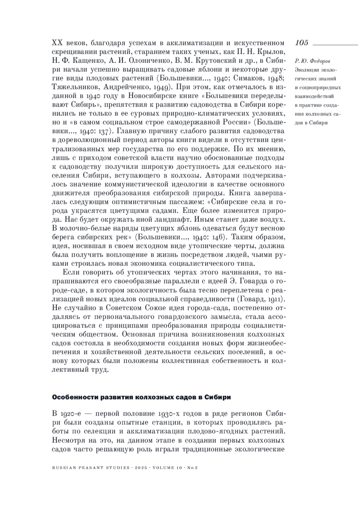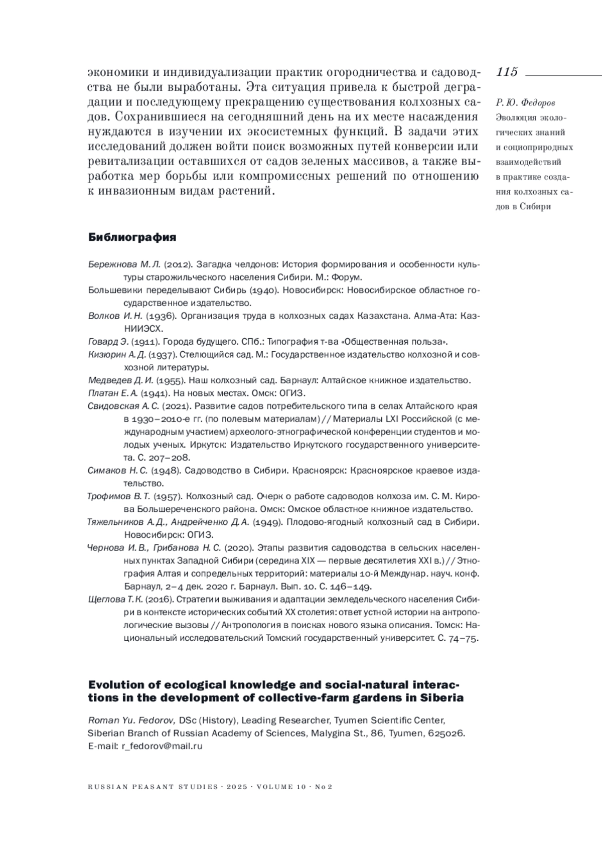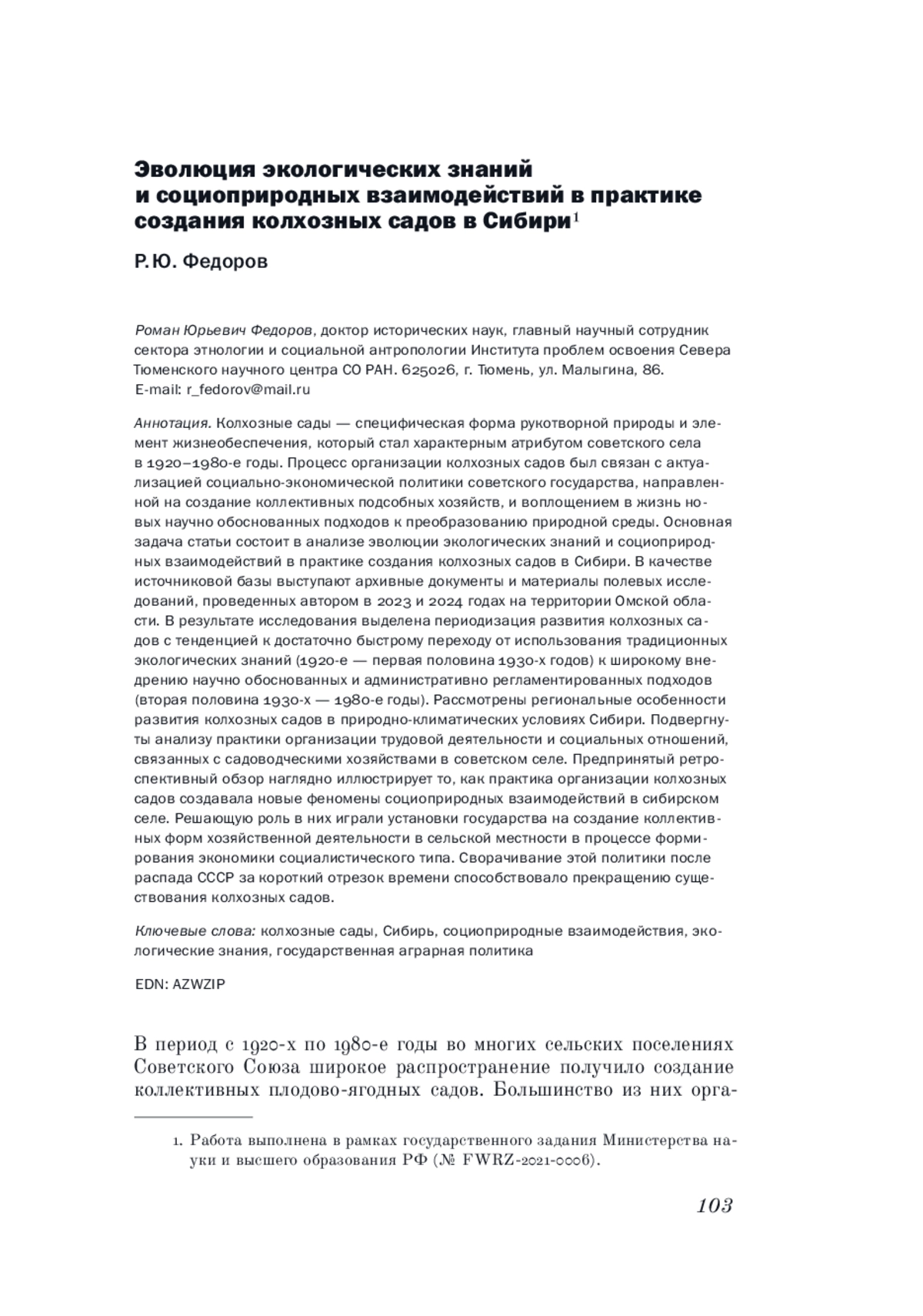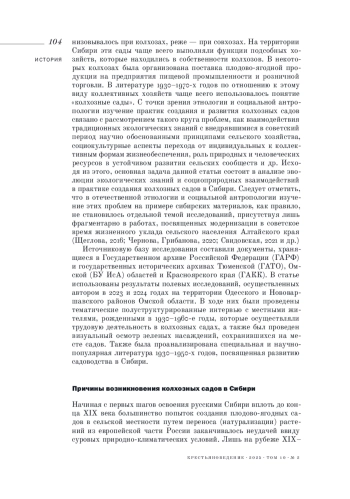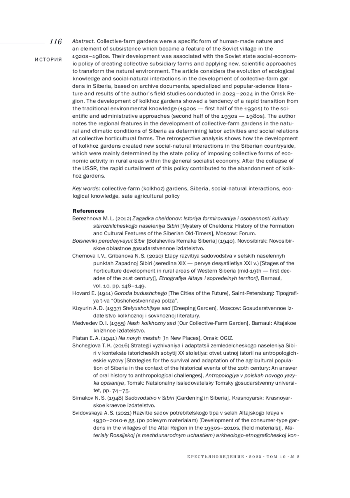 Колхозные сады - специфическая форма рукотворной природы и элемент жизнеобеспечения, который стал характерным атрибутом советского села в 1920-1980-е годы. Процесс организации колхозных садов был связан с актуализацией социально-экономической политики советского государства, направленной на создание коллективных подсобных хозяйств, и воплощением в жизнь новых научно обоснованных подходов к преобразованию природной среды. Основная задача статьи состоит в анализе эволюции экологических знаний и социоприродных взаимодействий в практике создания колхозных садов в Сибири. В качестве источниковой базы выступают архивные документы и материалы полевых исследований, проведенных автором в 2023 и 2024 годах на территории Омской области. В результате исследования выделена периодизация развития колхозных садов с тенденцией к достаточно быстрому переходу от использования традиционных экологических знаний (1920-е - первая половина 1930-х годов) к широкому внедрению научно обоснованных и административно регламентированных подходов (вторая половина 1930-х - 1980-е годы). Рассмотрены региональные особенности развития колхозных садов в природно-климатических условиях Сибири. Подвергнуты анализу практики организации трудовой деятельности и социальных отношений, связанных с садоводческими хозяйствами в советском селе. Предпринятый ретроспективный обзор наглядно иллюстрирует то, как практика организации колхозных садов создавала новые феномены социоприродных взаимодействий в сибирском селе. Решающую роль в них играли установки государства на создание коллективных форм хозяйственной деятельности в сельской местности в процессе формирования экономики социалистического типа. Сворачивание этой политики после распада СССР за короткий отрезок времени способствовало прекращению существования колхозных садов.