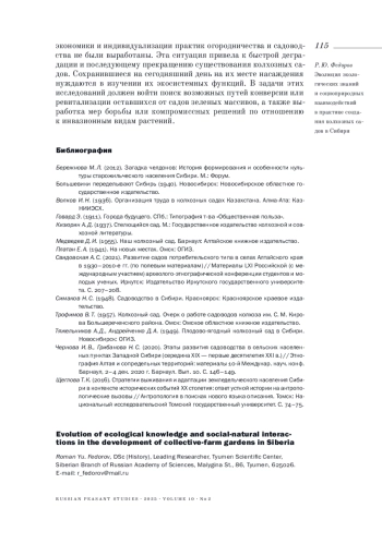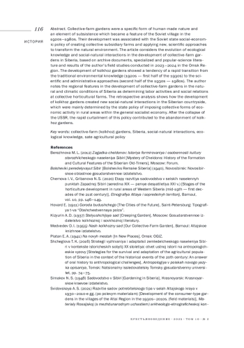 8. 	Свидовская А. С. (2021). Развитие садов потребительского типа в селах Алтайского края в 1930-2010-е гг. (по полевым материалам) // Материалы LХI Российской (с международным участием) археолого-этнографической конференции студентов и молодых ученых. Иркутск: Издательство Иркутского государственного университета. С. 207-208.  EDN: MRUYNR