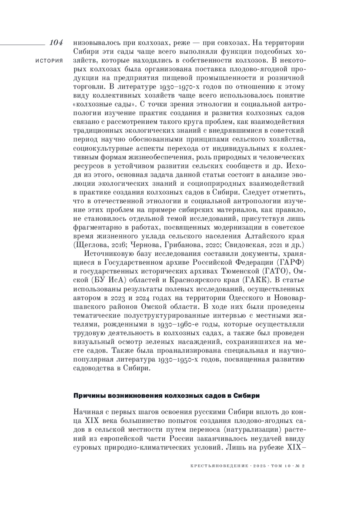 В период с 1920-х по 1980-е годы во многих сельских поселениях Советского Союза широкое распространение получило создание коллективных плодово-ягодных садов. Большинство из них организовывалось при колхозах, реже — при совхозах. На территории Сибири эти сады чаще всего выполняли функции подсобных хозяйств, которые находились в собственности колхозов. В некоторых колхозах была организована поставка плодово-ягодной продукции на предприятия пищевой промышленности и розничной торговли. В литературе 1930–1970-х годов по отношению к этому виду коллективных хозяйств чаще всего использовалось понятие «колхозные сады». С точки зрения этнологии и социальной антропологии изучение практик создания и развития колхозных садов связано с рассмотрением такого круга проблем, как взаимодействия традиционных экологических знаний с внедрявшимися в советский период научно обоснованными принципами сельского хозяйства, социокультурные аспекты перехода от индивидуальных к коллективным формам жизнеобеспечения, роль природных и человеческих ресурсов в устойчивом развитии сельских сообществ и др