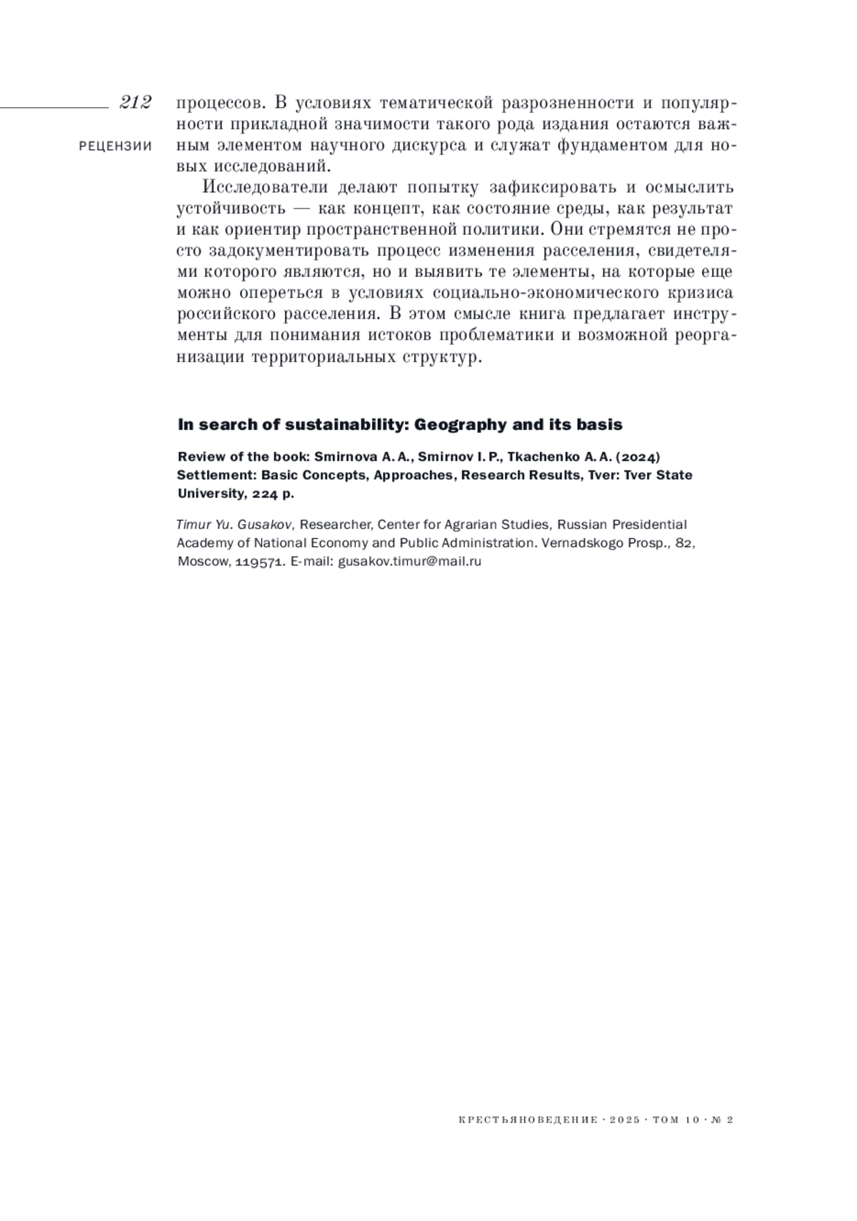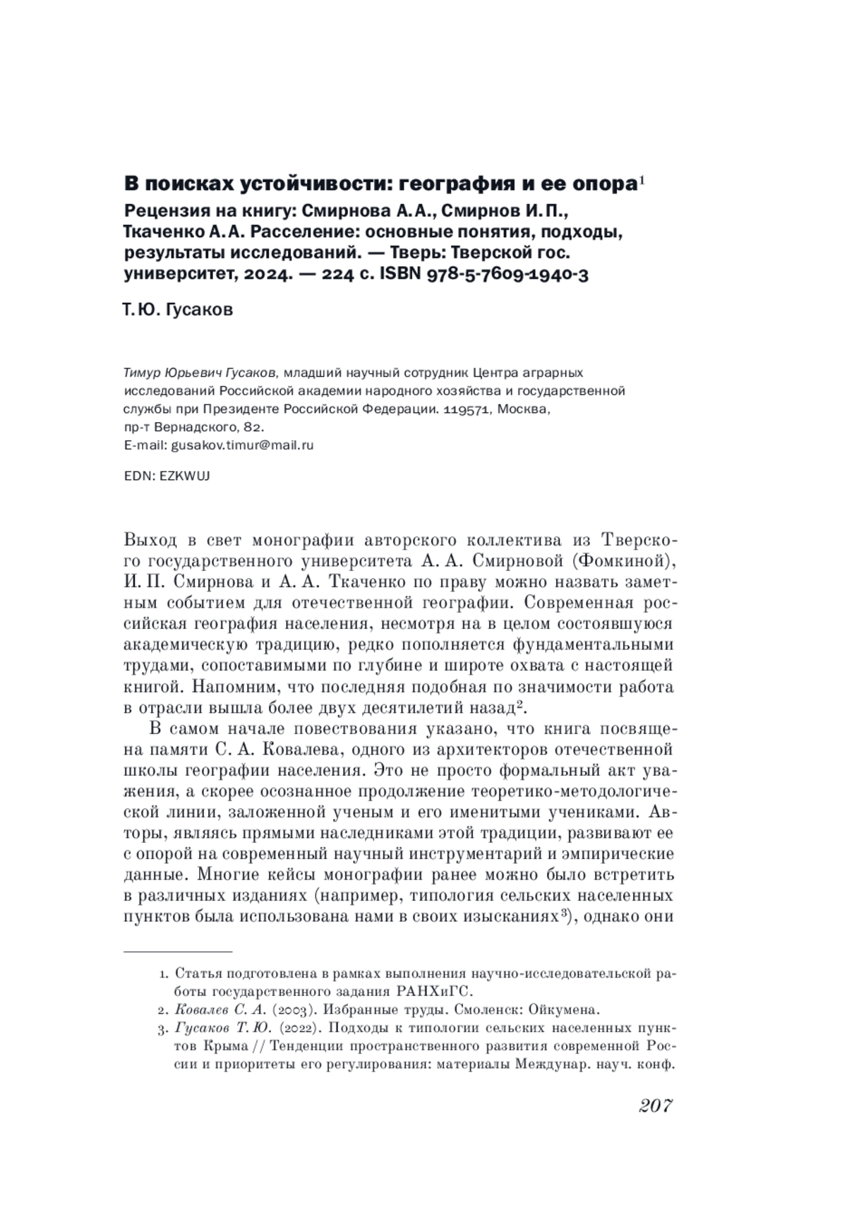 Рецензия на книгу: Смирнова А. А., Смирнов И. П., Ткаченко А. А. Расселение: основные понятия, подходы, результаты исследований. - Тверь: Тверской гос. университет, 2024. - 224 с. ISBN 978-5-7609-1940-3