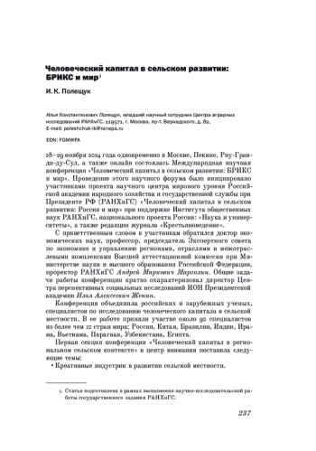 28–29 ноября 2024 года одновременно в Москве, Пекине, Риу-Гранди-ду-Сул, а также онлайн состоялась Международная научная конференция «Человеческий капитал в сельском развитии: БРИКС и мир». Проведение этого научного форума было инициировано участниками проекта научного центра мирового уровня Российской академии народного хозяйства и государственной службы при Президенте РФ (РАНХиГС) «Человеческий капитал в сельском развитии: Россия и мир» при поддержке Института общественных наук РАНХиГС, национального проекта России: «Наука и университеты», а также редакции журнала «Крестьяноведение»