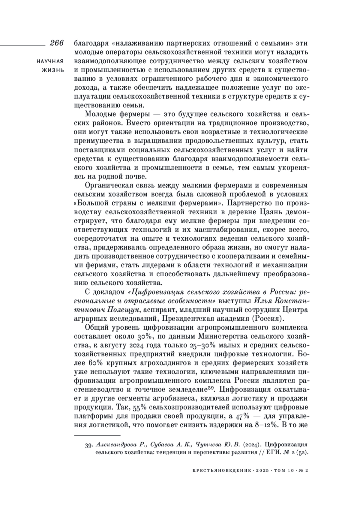 2. Александрова Р., Субаева А. К., Чутчева Ю. В. (2024). Цифровизация сельского хозяйства: тенденции и перспективы развития // ЕГИ. № 2 (52).