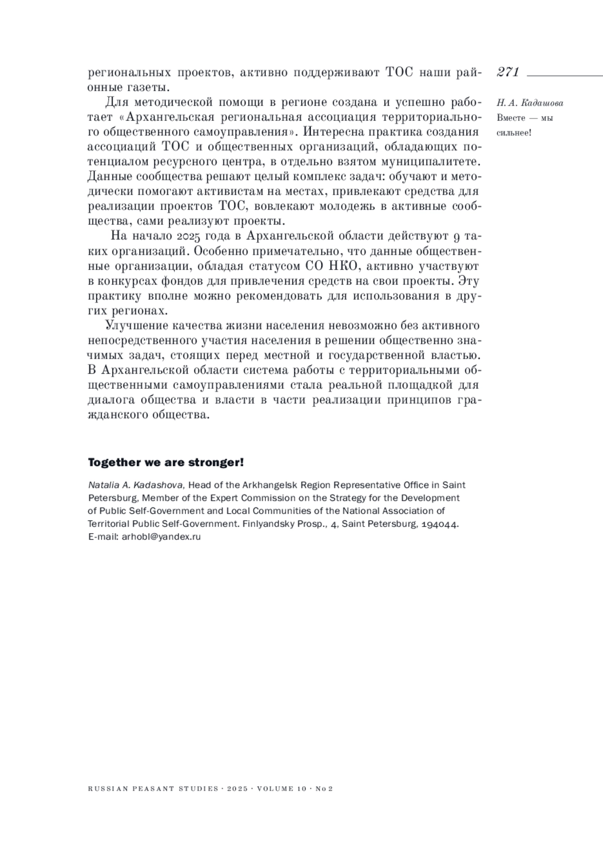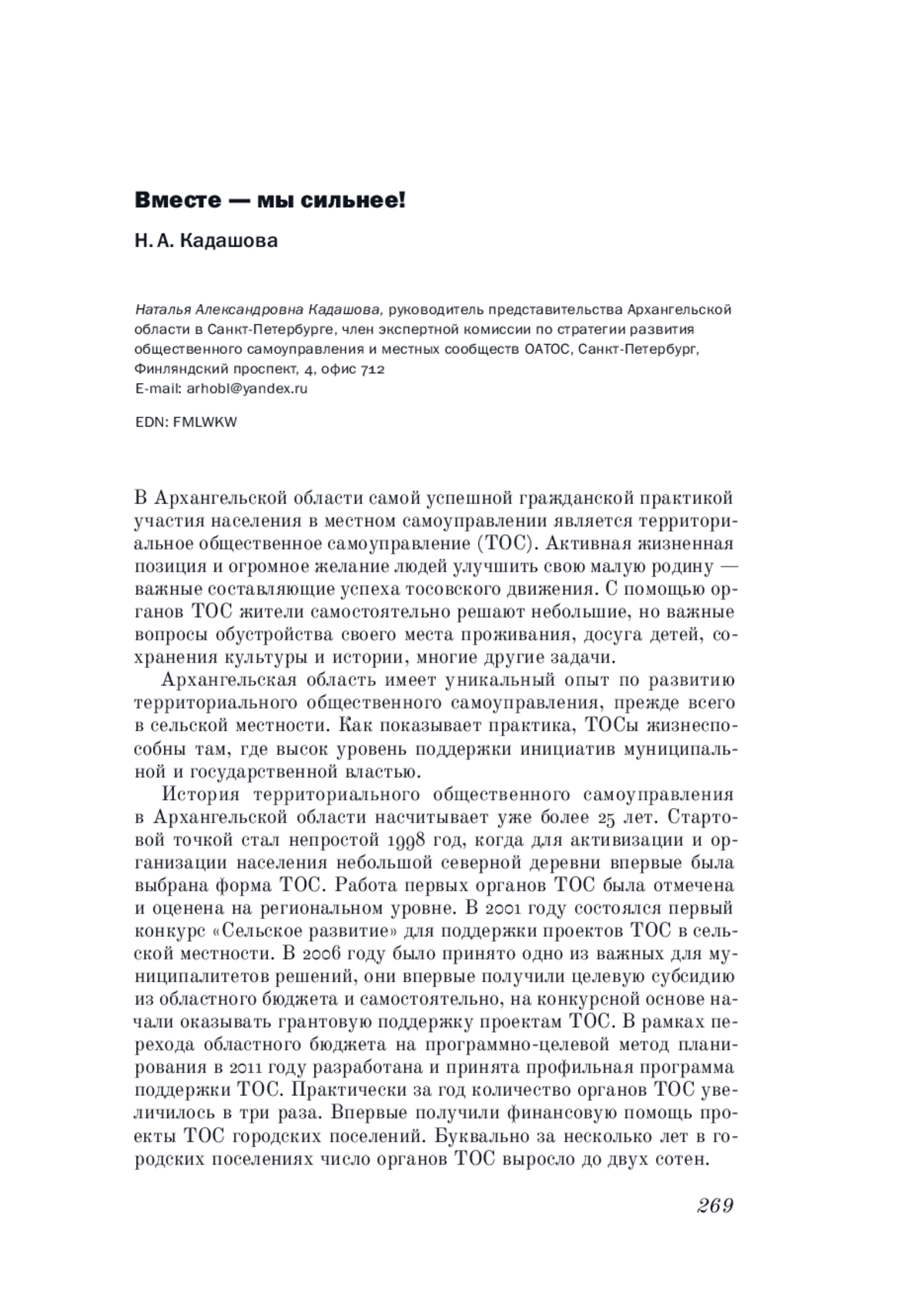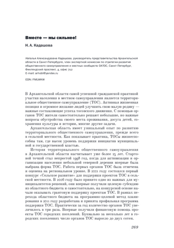 В Архангельской области самой успешной гражданской практикой участия населения в местном самоуправлении является территориальное общественное самоуправление (ТОС). Активная жизненная позиция и огромное желание людей улучшить свою малую родину — важные составляющие успеха тосовского движения. С помощью органов ТОС жители самостоятельно решают небольшие, но важные вопросы обустройства своего места проживания, досуга детей, сохранения культуры и истории, многие другие задачи