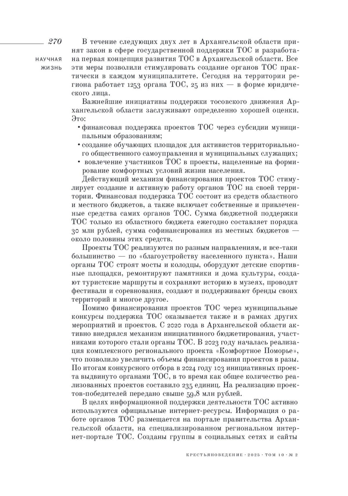 Воронежская область — одна из лидеров в развитии территориального общественного самоуправления России. За последние 10 лет в области создано более 2400 ТОСов, членами которых являются около полумиллиона жителей. В поддержку движения ТОСов в регионе действуют два грантооператора: АНО «Образ будущего» и Ассоциация «Совет муниципальных образований Воронежской области». В 2024 году создана Ассоциация ТОС и местных сообществ Воронежской области. Координирующую роль выполняет комитет Воронежской областной думы по местному самоуправлению и министерство внутренней политики. Данный системный опыт развития ТОС-движения является, безусловно, актуальным и перспективным общественным явлением, требующим еще своего внимательного научного изучения и осмысления