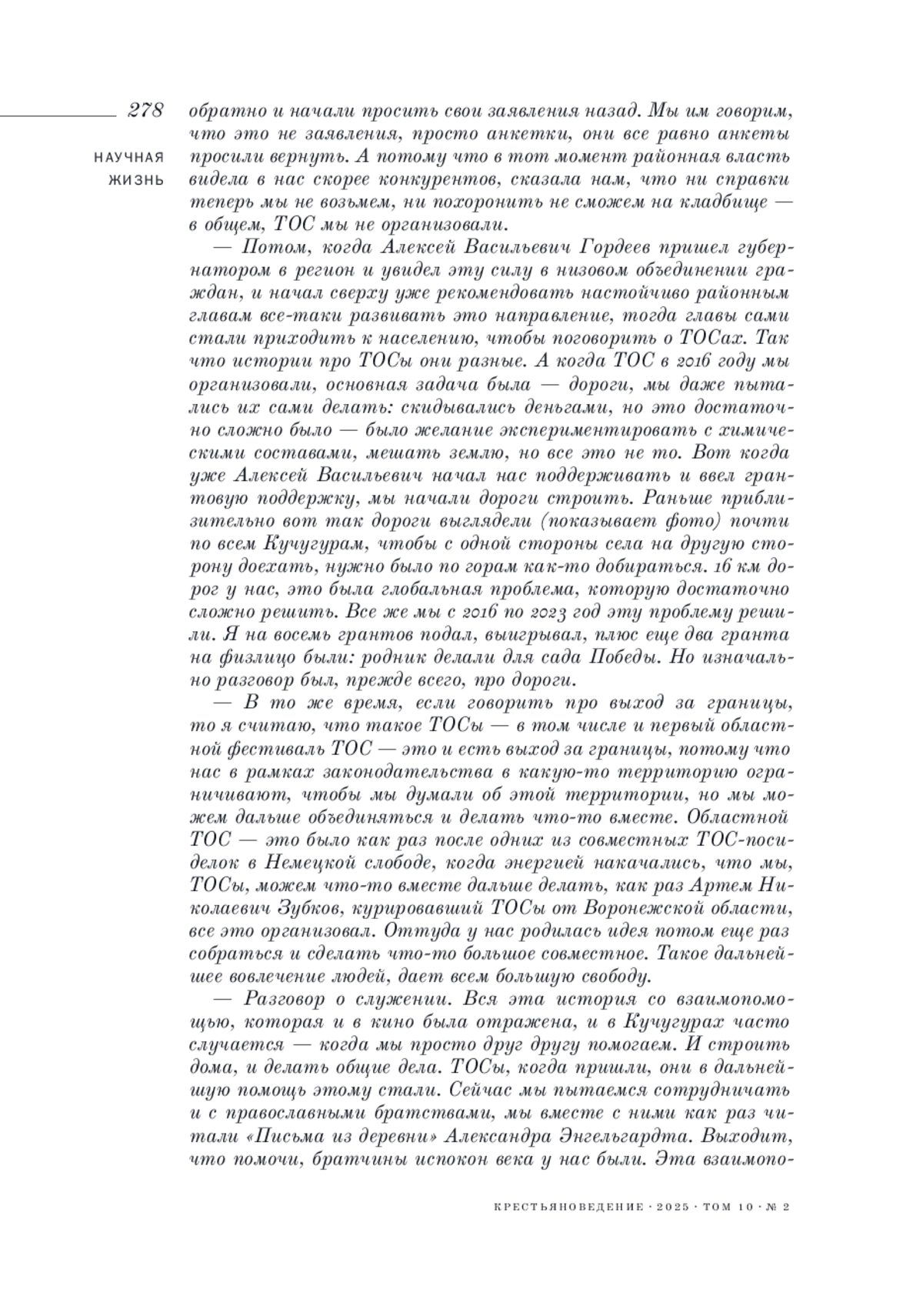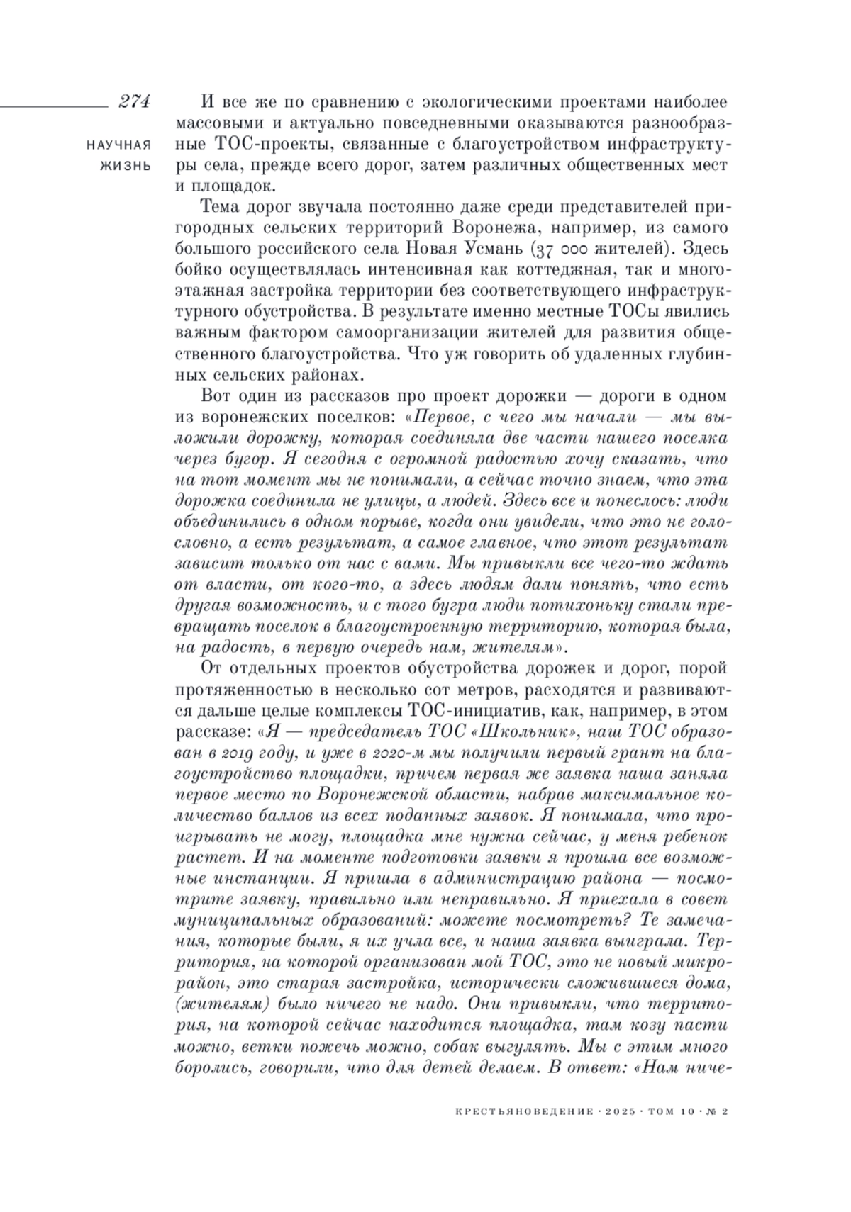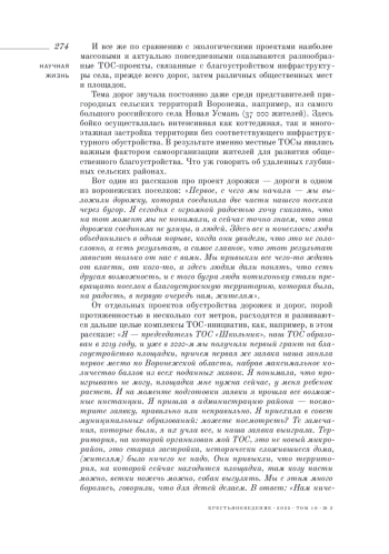 Воронежская область — одна из лидеров в развитии территориального общественного самоуправления России. За последние 10 лет в области создано более 2400 ТОСов, членами которых являются около полумиллиона жителей. В поддержку движения ТОСов в регионе действуют два грантооператора: АНО «Образ будущего» и Ассоциация «Совет муниципальных образований Воронежской области». В 2024 году создана Ассоциация ТОС и местных сообществ Воронежской области. Координирующую роль выполняет комитет Воронежской областной думы по местному самоуправлению и министерство внутренней политики. Данный системный опыт развития ТОС-движения является, безусловно, актуальным и перспективным общественным явлением, требующим еще своего внимательного научного изучения и осмысления