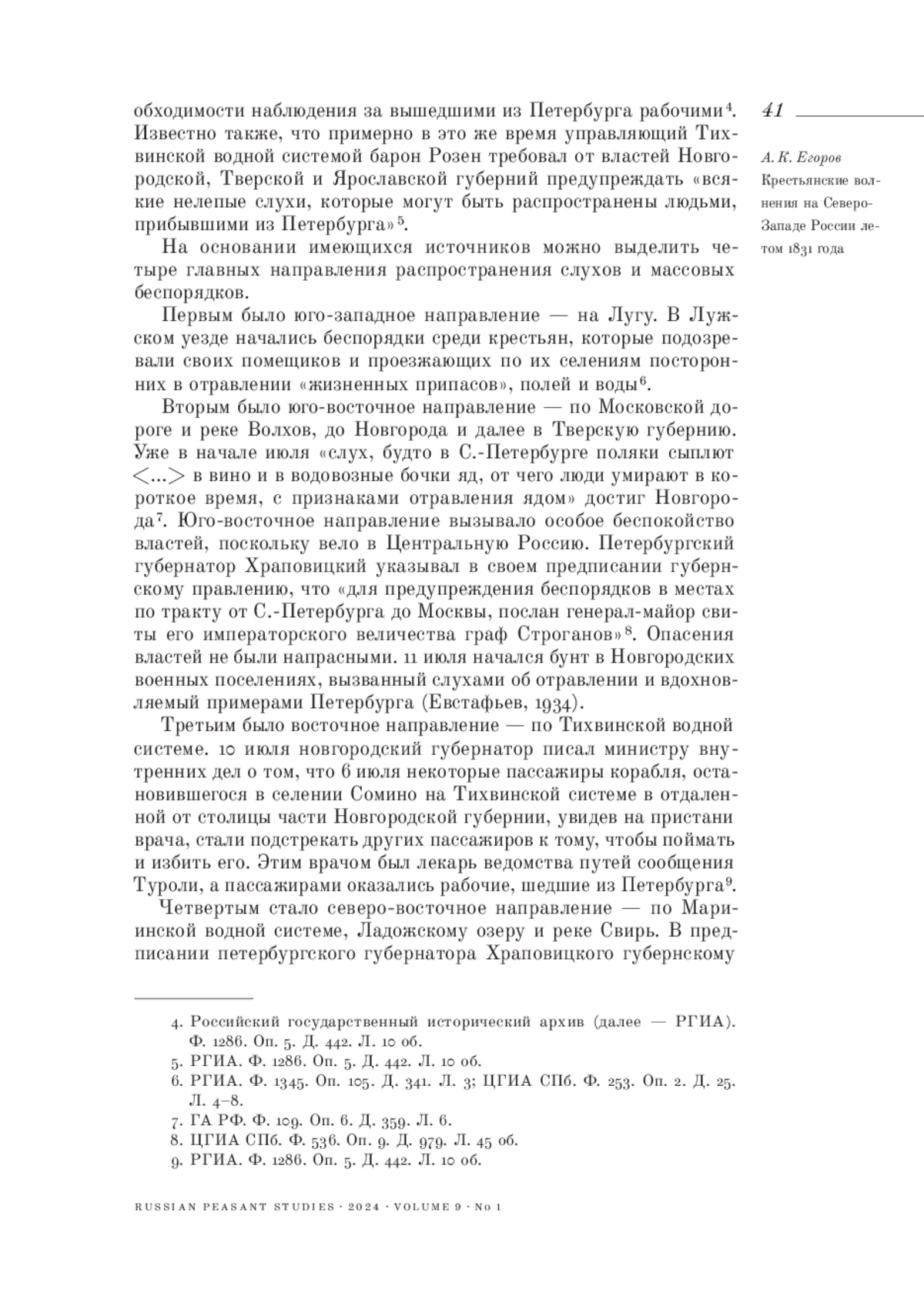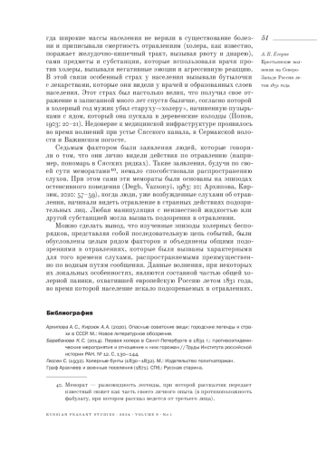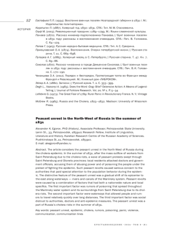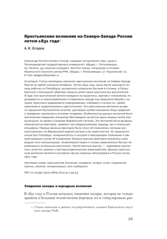Статья посвящена изучению крестьянских волнений на Северо-Западе России во время холерной эпидемии. Летом 1831 года, сразу после массового исхода рабочих из Петербурга, вызванного холерными бунтами в столице, в Петербургской и Олонецкой губерниях прошла целая серия крестьянских выступлений. В ходе этих выступлений жители нападали на карантины, врачей и чиновников, подозревая их в злоупотреблениях и отравлении народа под предлогом борьбы с холерой. Крестьяне задерживали подозреваемых, избивали и пытали их, требуя признания в предполагаемых преступлениях. Эти крестьянские волнения вызвали серьезное беспокойство властей, уделявших особое внимание сбору сведений о поведении населения в условиях эпидемии. Особенностью данных волнений было постепенное смещение эпицентра беспорядков на восток вдоль водных путей коммуникации: по рекам и каналам Мариинской системы. Эти волнения были вызваны совокупностью факторов, имевших как общероссийскую природу, так и локальную специфику. Первым важным фактором были слухи об отравлении, которые распространялись по Мариинской водной системе и ее окрестностям. Их первоисточником был Петербург, холерные бунты в котором стимулировали появление и распространение слухов об отравлении. Вторым важным фактором оказались сами водные пути коммуникации, позволявшие людям и слухам сравнительно быстро перемещаться на большие расстояния. Третий важный фактор - недоверие населения к властям, врачам и противоэпидемическим мероприятиям. Данные крестьянские волнения являются составной частью холерных беспорядков в России летом 1831 года.