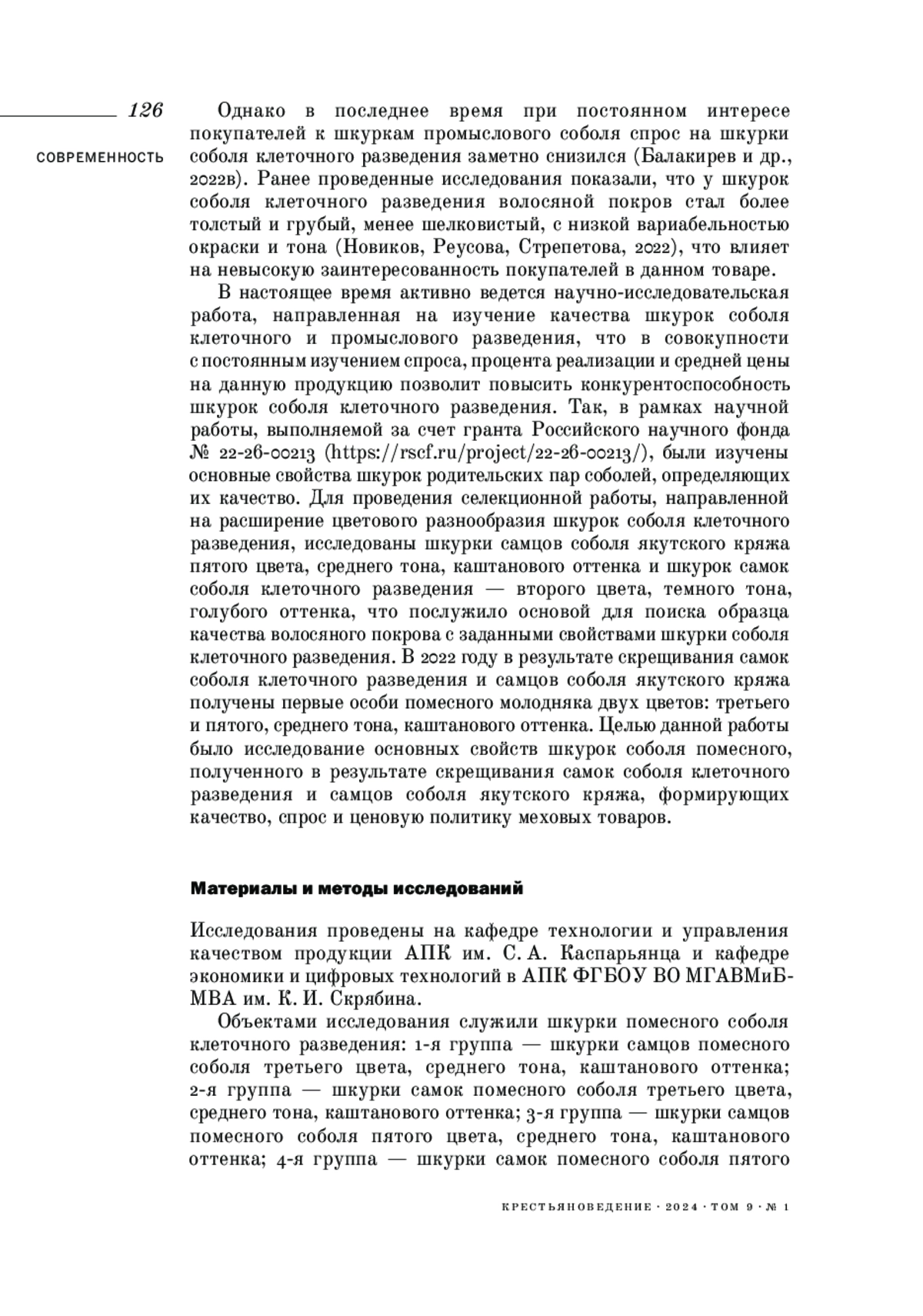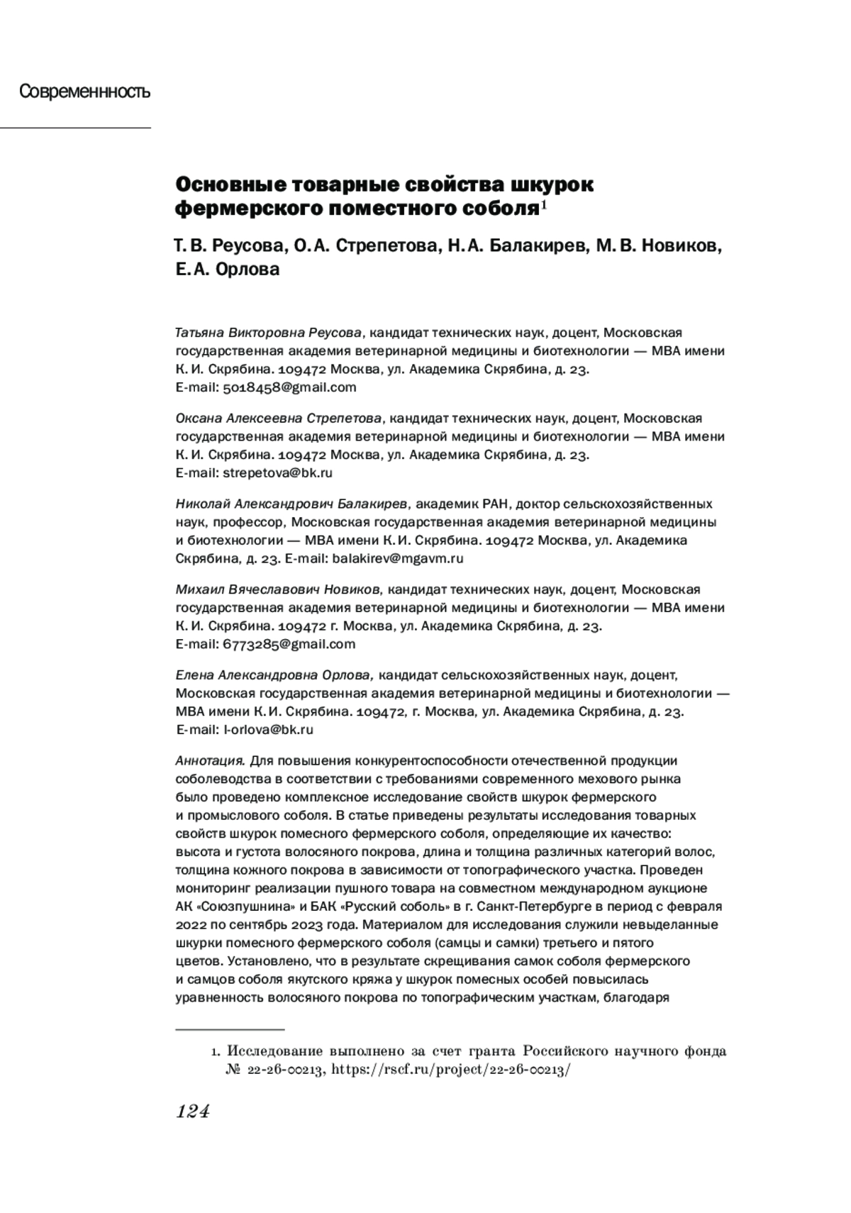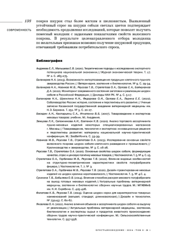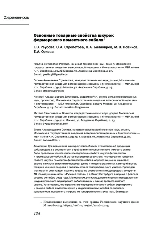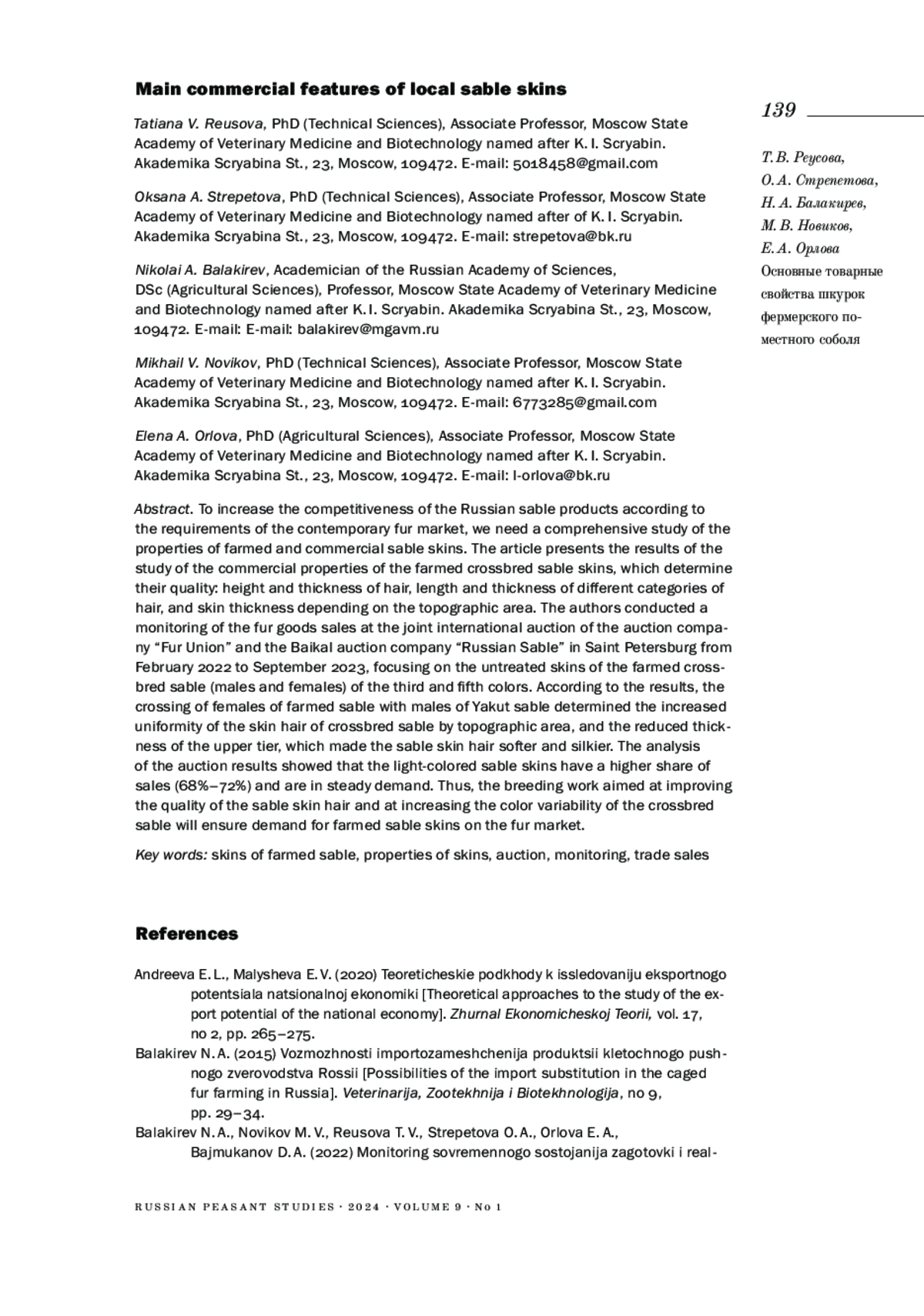 7. 	Новиков М. В., Реусова Т. В., Стрепетова О. А. (2023). Исследование основных свойств волосяного покрова шкурок соболя клеточного разведения и промыслового // Кролиководство и звероводство. № 3. С. 16-26.  EDN: DOIOCA