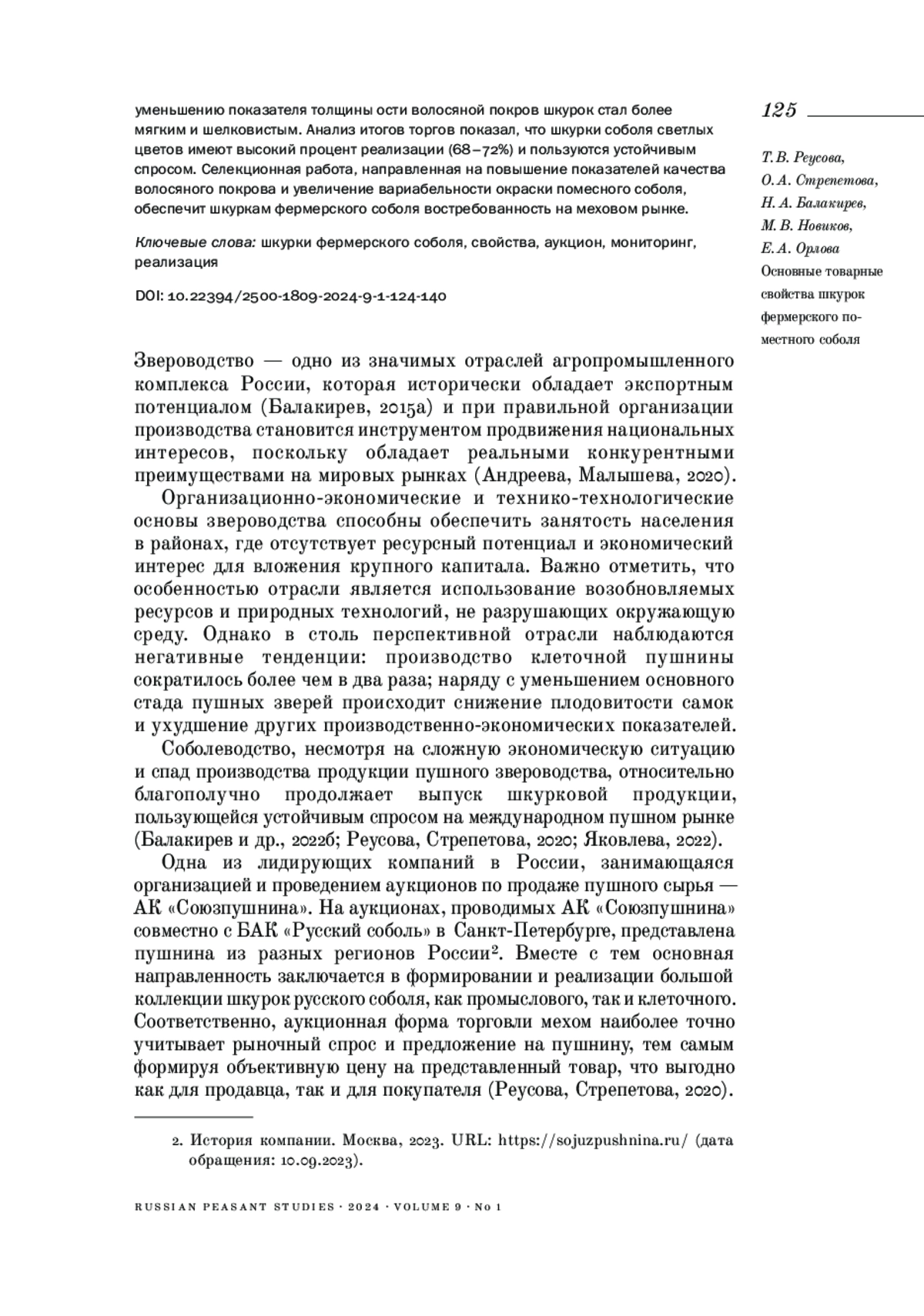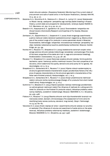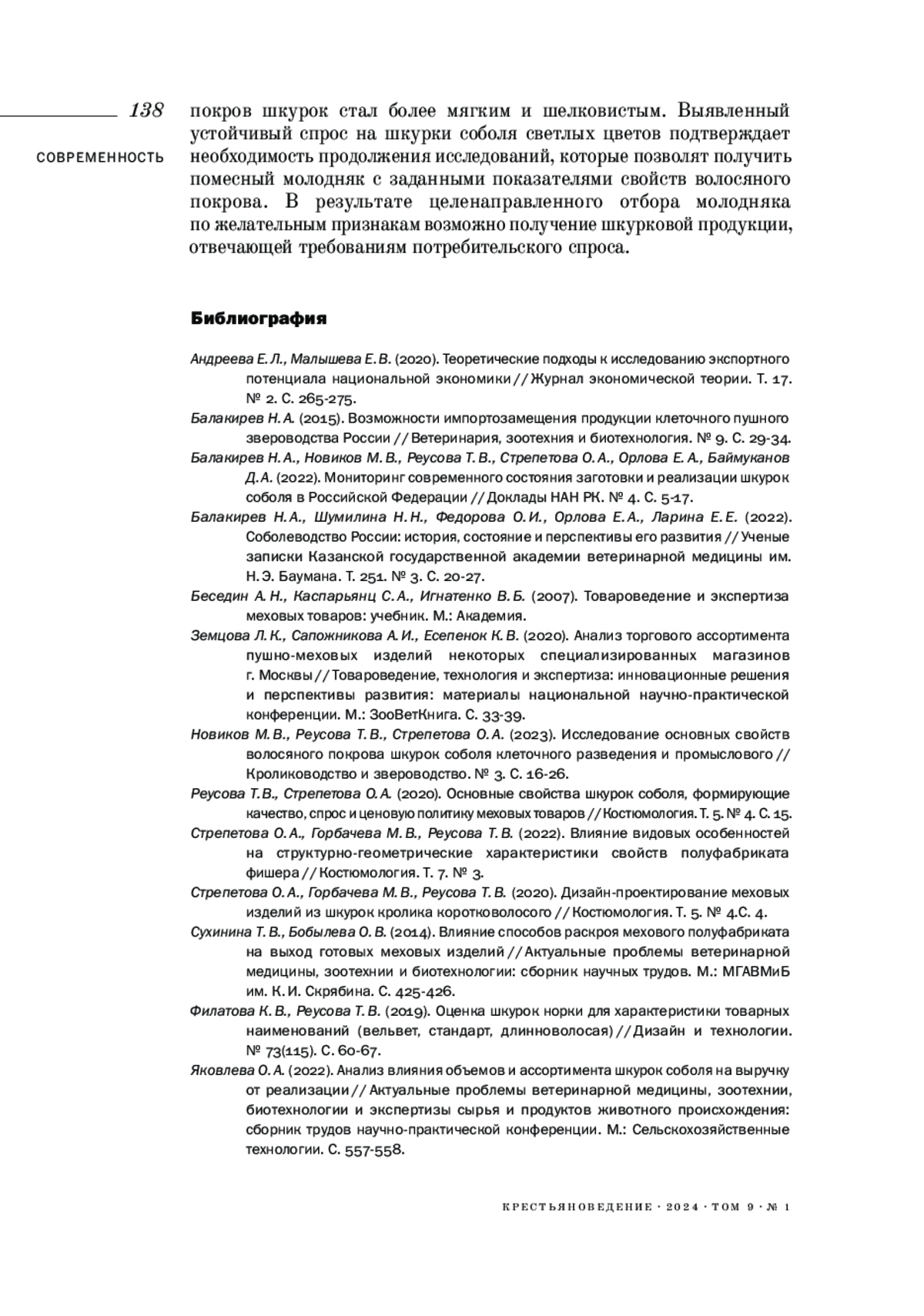 8. 	Реусова Т. В., Стрепетова О. А. (2020). Основные свойства шкурок соболя, формирующие качество, спрос и ценовую политику меховых товаров // Костюмология. Т. 5. № 4. С. 15.  EDN: WOTJOY