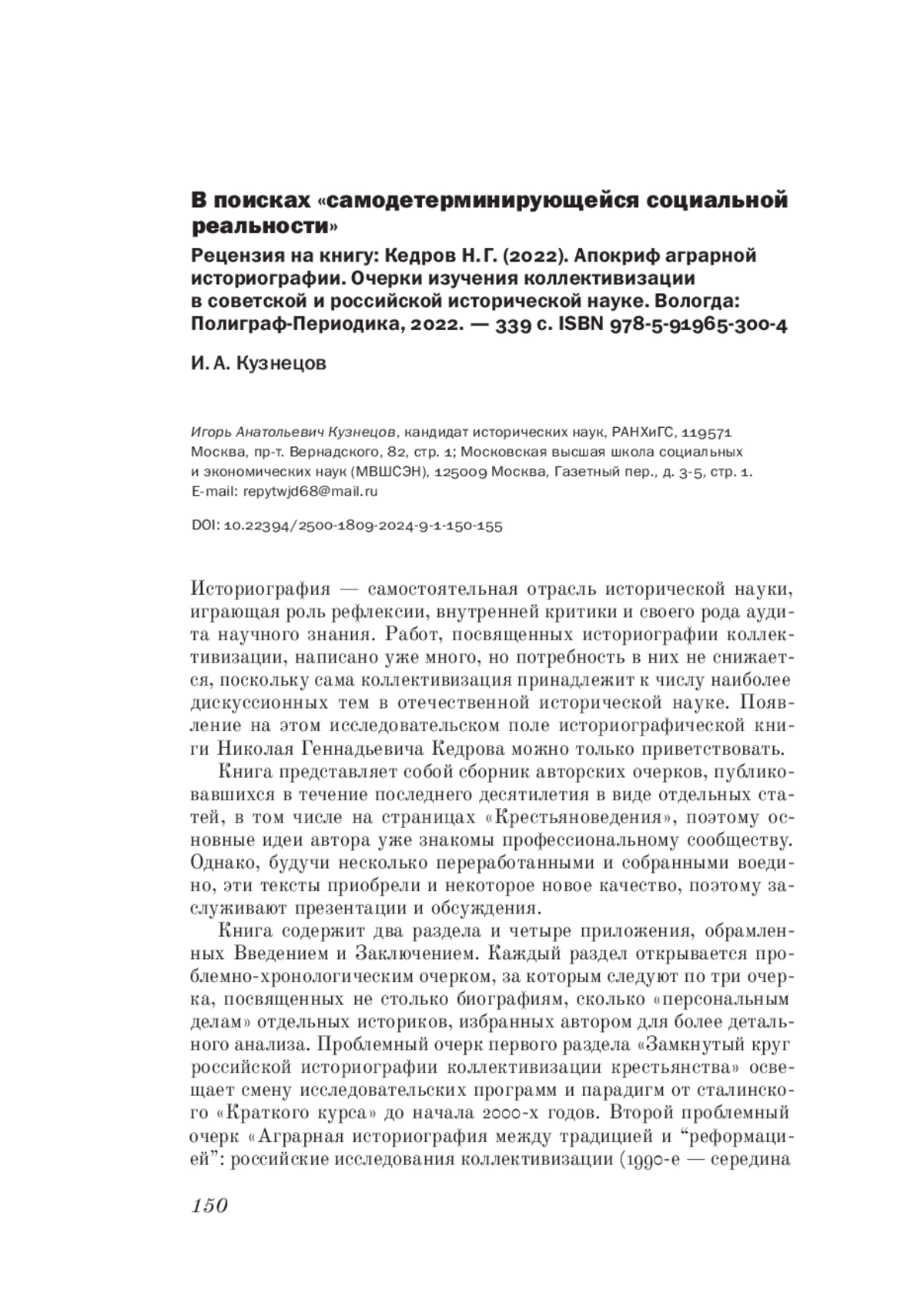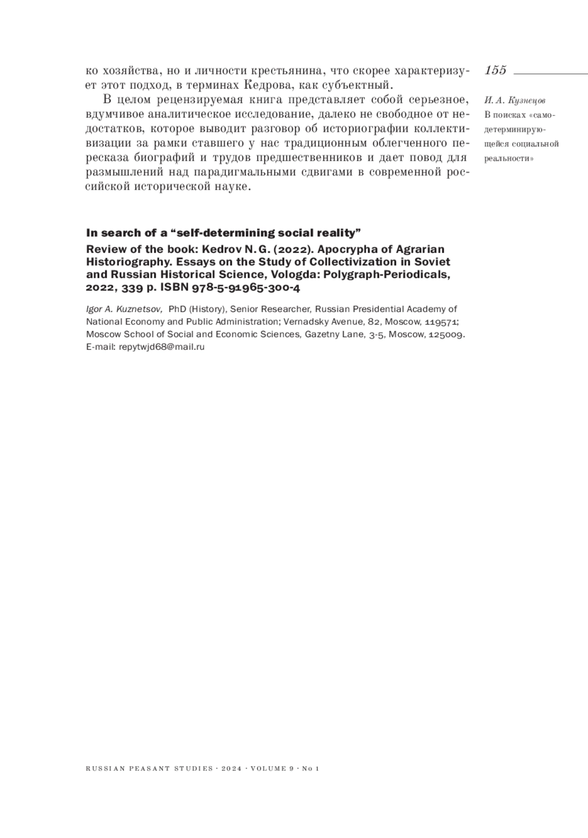 Рецензия на книгу: Кедров Н. Г. (2022). Апокриф аграрной историографии. Очерки изучения коллективизации в советской и российской исторической науке. Вологда: Полиграф-Периодика, 2022. - 339 с. ISBN 978-5-91965-300-4